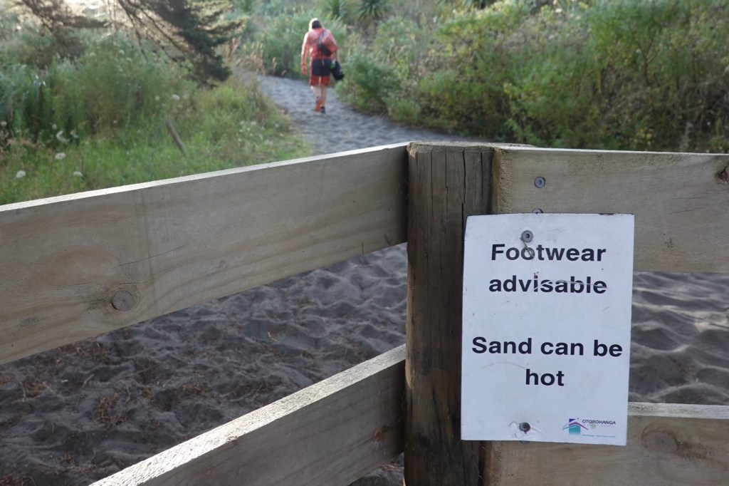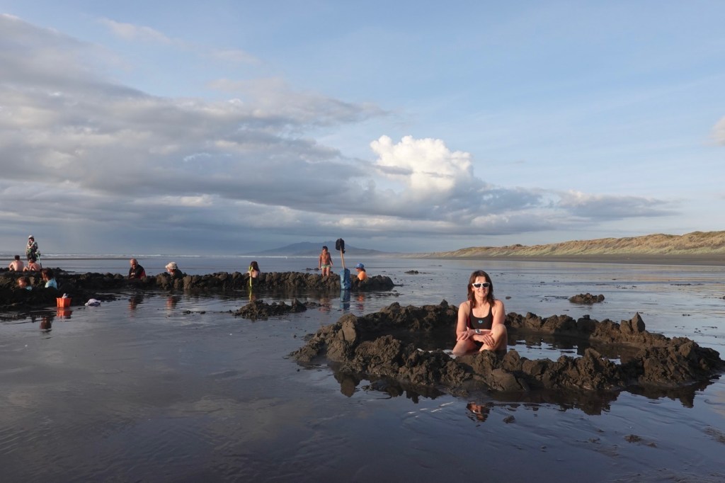 Nur über eine Gravelroad kommen wir zu unserem ersten Campingplatz. Der Besitzer informiert uns über alle Sehenswürdigkeiten der Region. Ganz in der Nähe ist ein Hot Water Beach. Er gibt uns Spaten mit, um Löcher in den Sand zu buddeln. Dann kann man im warmen Wasser baden. Alles hier auf der Nordinsel ist vulkanisch. Der Strand besteht aus schwarzem Lavasand und das warme Wasser aus der Tiefe riecht nach Schwefel. Wir genießen unser Bad im Sonnenuntergang.