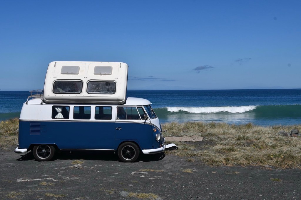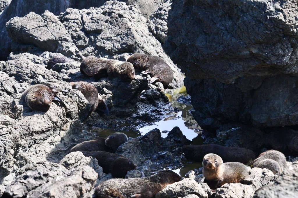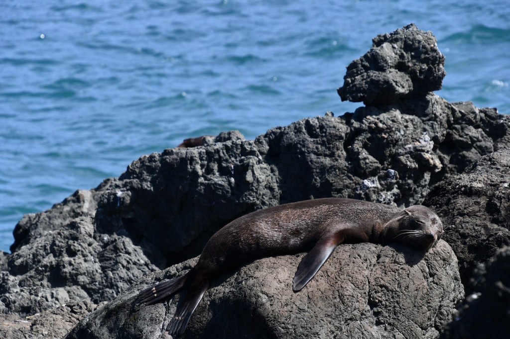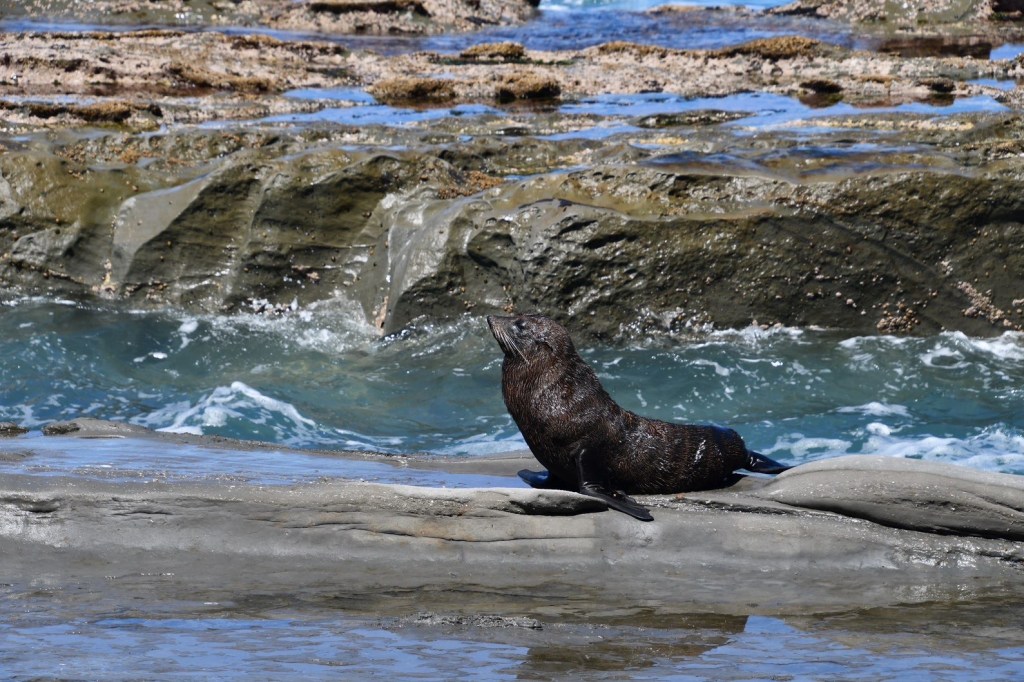 Der zweite Stopp ist an einer Kolonie von Pelzrobben, Seals. Sie haben gerade Nachwuchs. Kleine putzige Robben mit Kulleraugen jagen einander nach und plantschen im glasklaren Wasser. Vom benachbarten Leuchtturm können wir das gesamte Kap überblicken. Grüne steile Hügel bilden die Kulisse für die langen schwarzen Strände aus Vulkansand. Die weißen Brandungswellen bilden einen tollen Kontrast dazu. Das Meer ist türkisblau. Ein fantastisches Farbenspiel. Der neuseeländische Sommer zeigt sich von seiner schönsten Seite: 27 Grad und keine einzige Wolke.