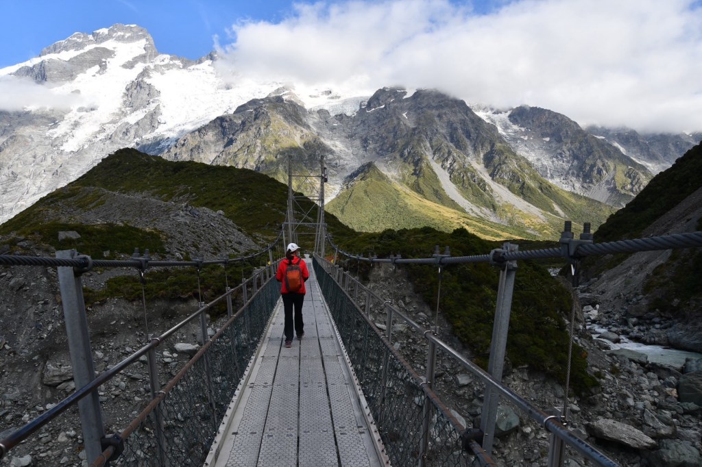 Der Wecker klingelt früh. Wir starten zeitig zu unserer Wanderung im Nationalpark. Bevor zu viele Leute unterwegs sind. Der Hooker Valley Track ist sehr populär. Der Weg führt uns immer näher an den Aoraki. Vorbei an dem Mueller Glacier mit grandiosen Aussichtspunkten. Drei spektakuläre Hängebrücken führen über den Hooker River. Es geht über Moränen und durch das breite Flusstal. Neben uns ragt der Mount Sefton steil empor, an seinen Wänden gibt es hängende Gletscher mit vielen Spalten. Der Weg endet am Hooker Glacier Lake. Der Gletscherabbruch ist in der Ferne zu sehen. Wenn er kalbt, lösen sich kleine Eisberge ab und schwimmen durch den Gletschersee. Und alles wird überragt von dem Eisriesen Aoraki. Er ist ein wunderschöner Berg. Einer der schönsten, die wir bisher gesehen haben.