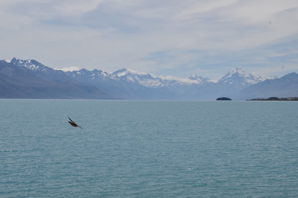In der Ferne können wir schon den Mount Cook erkennen. Er gehört zu den Seven Summits und ist der höchste Gipfel von Ozeanien. Wir fahren weiter zum Lake Pukaki. Er ist türkisblau, noch größer als der Tekapo und wird vom Tasman Gletscher, dem größten Neuseelands gespeist. Und er bietet eine grandiose Aussicht auf den Aoraki. Vom Campingplatz aus führt ein Fußweg bis zum Ufer. Es ist heiß und wir gehen schwimmen. Das Wasser ist so sauber und klar. Duschen können wir uns heute sparen. Wir sind begeistert von der Landschaft mit ihren Seen und Bergen. Und den Mount Cook verlieren wir bis zum Schlafengehen nicht mehr aus den Augen.