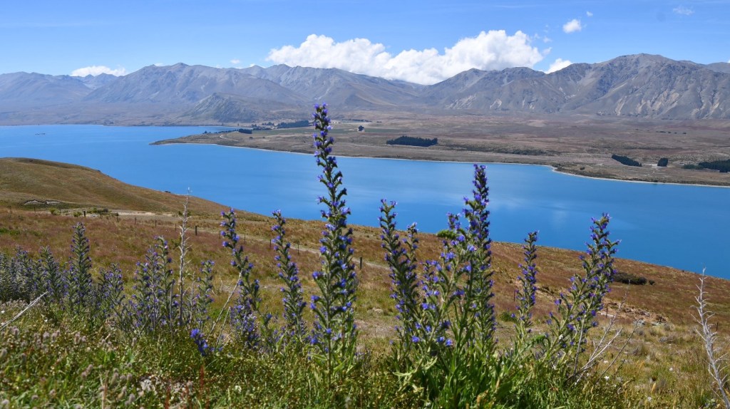 Neben dem Highway gibt es einen unbefestigten schmalen Radweg. Wir sehen einige Reiseradler. Weiter oben auch ganze organisierte Radgruppen mit Begleitfahrzeug, mit dem Mountainbike. Hier oben verläuft der Alps2Ocean Cycle Trail. Ohne uns. Wir halten am Lake Tekapo an. Ein riesiger See in hellblauer Farbe. Das strahlende Blau entsteht durch Fels-Partikel in dem Gletscherwasser, in denen sich das Licht bricht. Eine enge steile Bergstraße führt auf einen Aussichtsberg mit einem Observatorium der Universität. Auch hier ist ein Clear Dark Sky-Gebiet. Den Nachthimmel sieht man hier so klar wie an wenigen Orten auf der Welt. Jetzt ist es taghell und wir haben einen 360 Grad Ausblick auf den Lake Tekapo, Lake Alexandrina, die riesige Hochebene und die Bergkette der Südalpen.