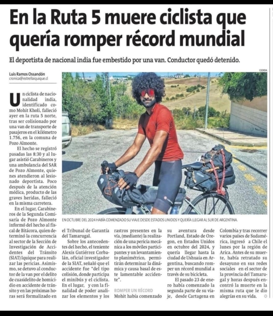 Ein indischer Radfahrer namens Mohit Kholi starb gestern auf Route 5 North, nachdem er bei Kilometer 1.756 in der Gegend von Pozo Almonte von einem Personentransporter angefahren wurde.