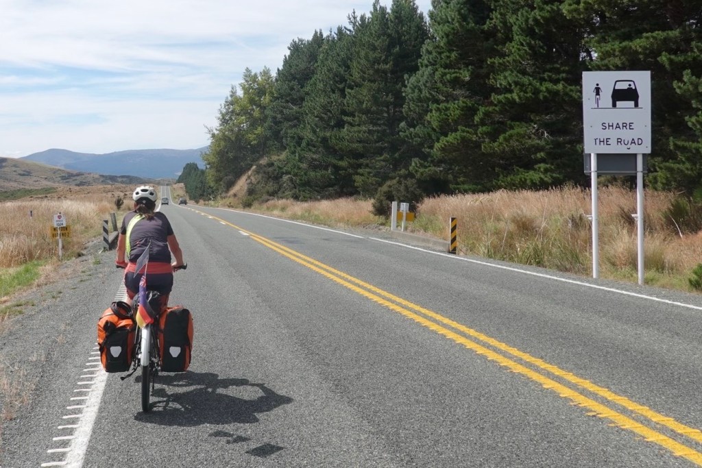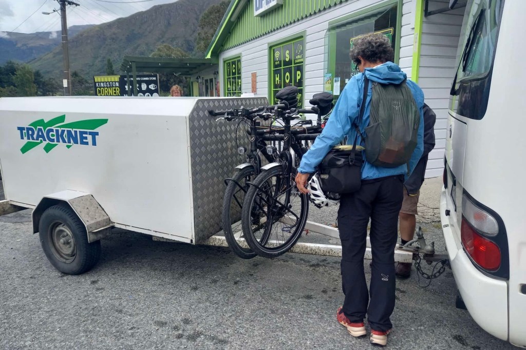 Um kurz nach eins fährt unser Bus. Wir haben Zeit zum Packen. Aus vier Taschen wird eine. Wir bekommen noch Klebeband vom Campingplatz zum Zubinden. Und die unhandlichen Säcke bringt der hilfsbereite Mitarbeiter mit einem Golf Caddy zur Bushaltestelle. Sie passen gerade noch in den Gepäckanhänger des Busses. Und die Räder kommen auf einen Radständer. Zwei Sitzplätze für uns sind noch frei. Leider auf der Bergseite. Die Straße gehört landschaftlich sicher zu den schönsten Neuseelands. Immer direkt am See. Aber für Radfahrer wegen der Enge und dem Verkehr kaum fahrbar.