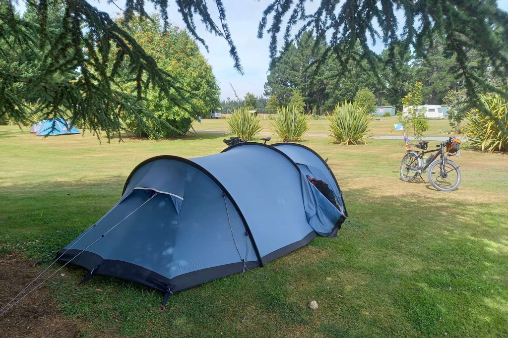 Deshalb ist der Highway von Kingston nach Queenstown sehr eng und kurvenreich. Es ist die Hauptverbindung vom Süden nach Queenstown. In Radforen wird empfohlen, sich für diese Strecke eine Transportmöglichkeit zu suchen. Wir fragen auf dem Campingplatz nach einem Busshuttle. Die Dame an der Rezeption ist sehr hilfsbereit. Sie bucht uns einen Bus für den nächsten Tag und handelt einen fairen Preis für uns aus. Sie besorgt uns Müllsäcke, damit wir aus vielen Radtaschen ein Gepäckstück machen können. Den ganzen Tag sollte es regnen, doch wir hatten Glück. Jetzt kommt der angekündigte Regen mit voller Wucht. Wir lassen unser Essen im weiter entfernten Restaurant sein und kaufen uns stattdessen im kleinen Store Nudeln, Tomaten und Linsen. Dann halt wieder Linsenspaghetti. Unser Hauptessen auf Tour. Ein Restaurant würden wir ohnehin nicht richtig genießen können.