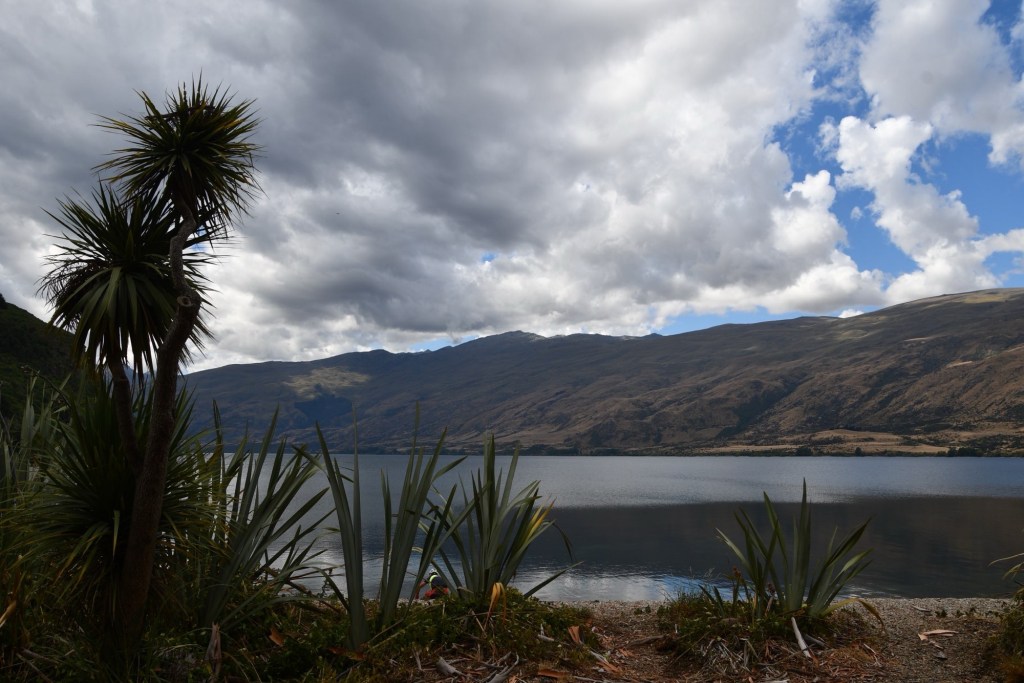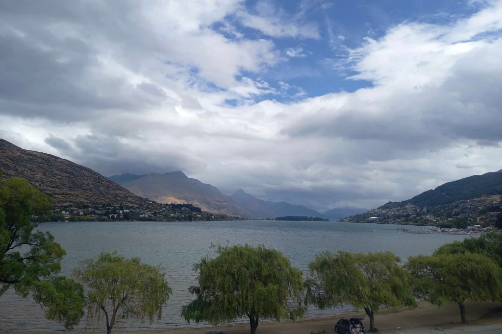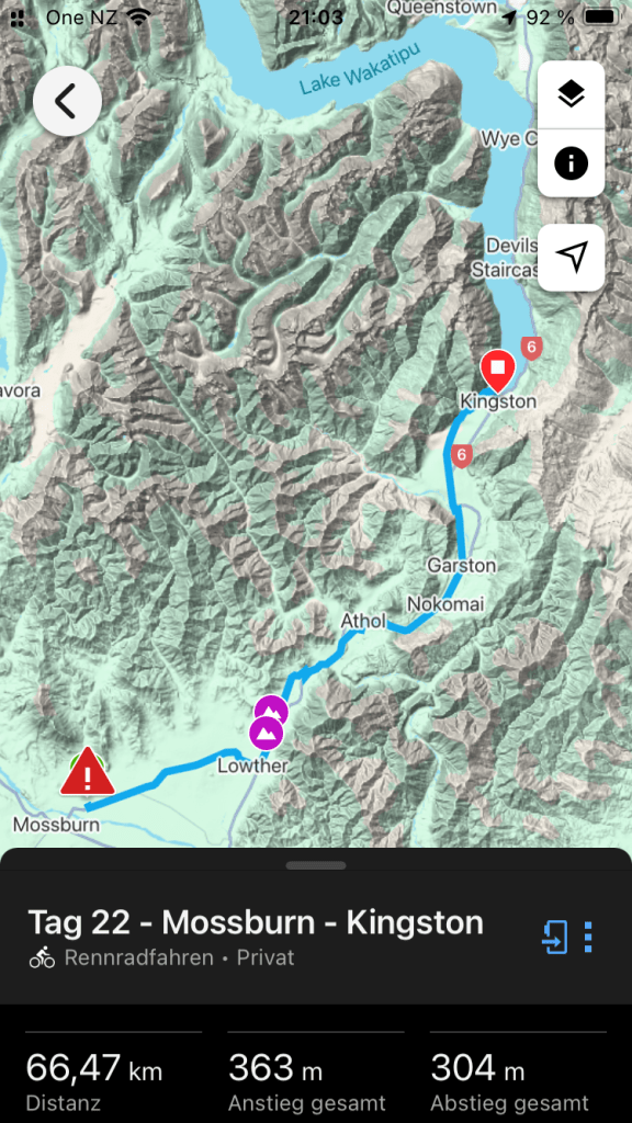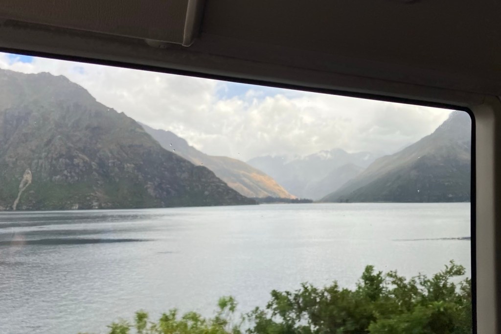 Die Berge sehen bizarr aus. Schwarze Wolken und sonnige Abschnitte schaffen ein Wechselspiel zwischen grauen nebelverhangenen Bergen und von der Sonne angestrahlten Spots. Wir hätten gerne an den Lookouts angehalten. Doch der Busfahrer hat es eilig. Er muss einige Fahrgäste rechtzeitig zum Airport Queenstown bringen. Wir steigen dort auch aus. Unser Campingplatz ist in der Nähe. Direkt am See. Sechs Kilometer vor Queenstown. Der einzige, der noch Stellplätze hatte. Aber auch einer der schönsten bisher. Nagelneu, modern, riesige Küche mit Essraum und Aussicht über den See. Wir genießen den Nachmittag und machen außer einkaufen einfach mal nichts mehr. Aah, doch noch was. Die nächsten Tage planen. Campingplätze, Unterkünfte und Versorgungsmöglichkeiten in Abhängigkeit von Streckenlängen, Höhenprofil und Wettervorhersagen.