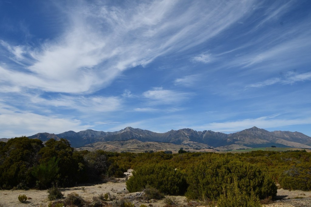 Die Landschaft ist interessant. Und zwischen den Bergen fließt der glasklare Oreti River. Kurz vor unserem Ziel gibt es ein Café in einem historischen Gebäude. Es war mal eine Community Hall. Unser Campingplatz ist abseits gelegen von Mossburn in einem parkähnlichen Gelände mit Alpakas, Pfauen, Schafen und Hühnern. Zwei schottische Angler erzählen uns von ihren Angelabenteuern. Das schwierigste dabei ist überhaupt an die Flüsse zu kommen. Entweder muss man durch Privatland und braucht eine Genehmigung der Farmer oder es gibt nur Busch. Wir telefonieren mit Sarah und versuchen, sie zu trösten. Regen plätschert auf unser Zelt. Er hilft beim Einschlafen.