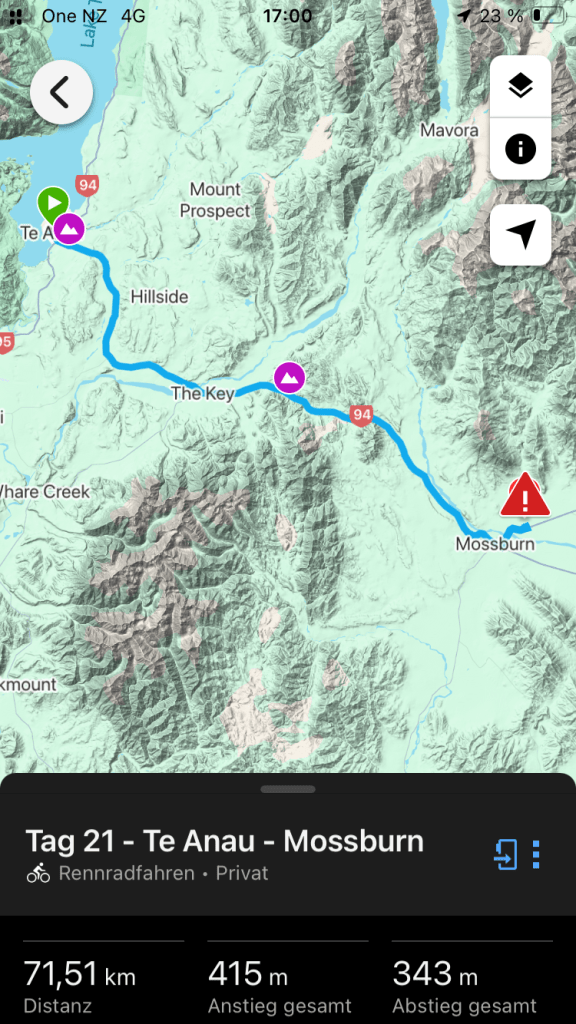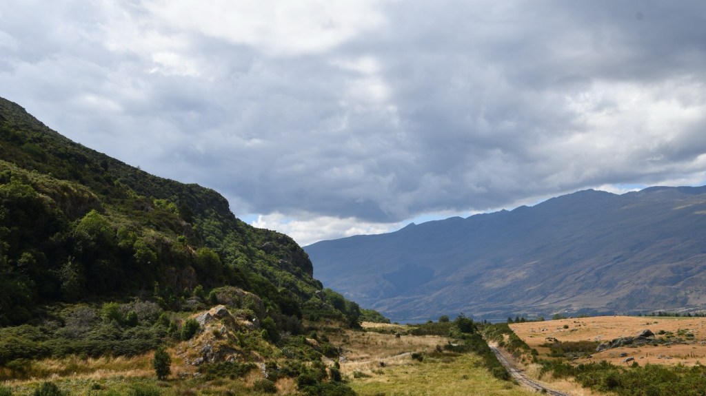 Nach ein paar Kilometern kommen wir wieder auf eine stark befahrene Straße. Wir sind etwas traumatisiert. Zumal wir jetzt wissen, dass Mohit von einem normalen Van von hinten überfahren wurde. Bei jedem anrasenden Fahrzeug halten wir die Luft an. Aber, heute haben wir eine Alternative. Wir wollen es versuchen und wechseln auf einen Radweg. Der Around the Mountains Cycle Trail führt in drei bis fünf Tagen von Kingston rund um ein Bergmassiv bis Queenstown. Er ist unbefestigt und staubig. Egal. Wir treffen einen Belgier mit Gravelbike, der uns entgegenkommt. Er sagt, der Weg wäre gut fahrbar, nur die vielen Gates, die Viehtore, würden nerven. Man muss öfters absteigen, Tor auf und Tor zu machen. Sonst hätten die Farmer den Weg bestimmt nicht genehmigt.