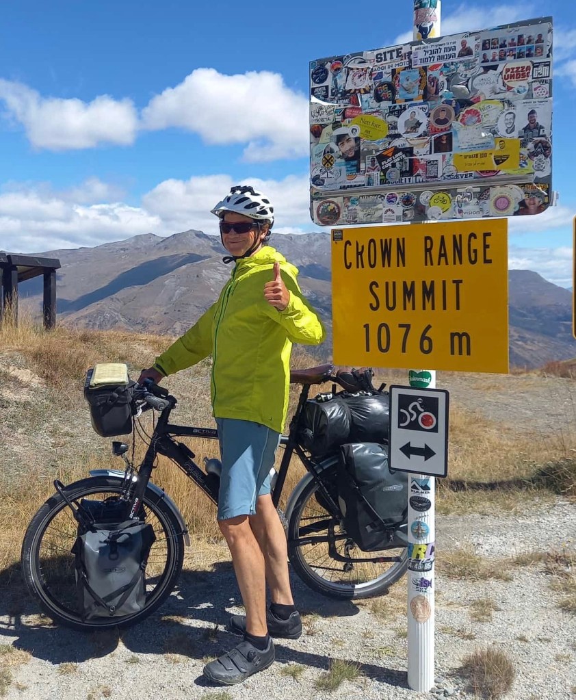 Doch nicht lange können wir die Aussicht genießen. Der zweite Anstieg naht. Er ist noch steiler als der Radweg und das über fast drei Kilometer. Sabine schiebt, Klaus fährt. Aber nicht viel schneller. Mit ca. 4 km/h kämpft er sich den Berg hoch. Manche Autos fahren sehr knapp an ihm vorbei. Sabine kann nicht hinsehen. Dann schaut sie doch nach vorne und sieht eine Radtasche im Straßengraben. Klaus hat in seinem Schneckentempo zu sehr geschwankt und ist in den Kies am Straßenrand geraten und gestürzt. Nicht schlimm, aber glücklicherweise kam gerade kein Auto von hinten. Endlich kommen wir auf der Passhöhe Crown Range Summit an, auf 1.076 m. Es ist die höchste asphaltierte Straße Neuseelands. Die Aussicht ist grandios. Wir essen unsere Brote und freuen uns auf die Abfahrt bis Wanaka. Dort schauen wir uns noch den berühmten Wanaka Tree an. Er ist ein beliebtes Fotomotiv besonders von Asiaten. Die Landschaft am See ist so schön, doch fotografiert wird ein mickriges Weidenbäumchen, das fast im Wasser steht.