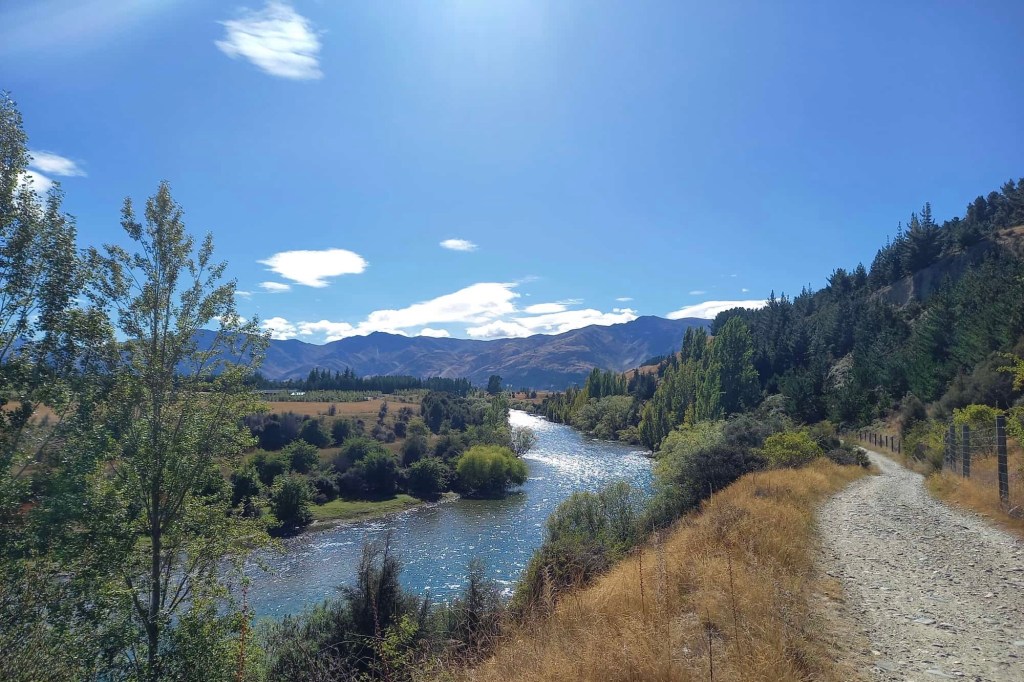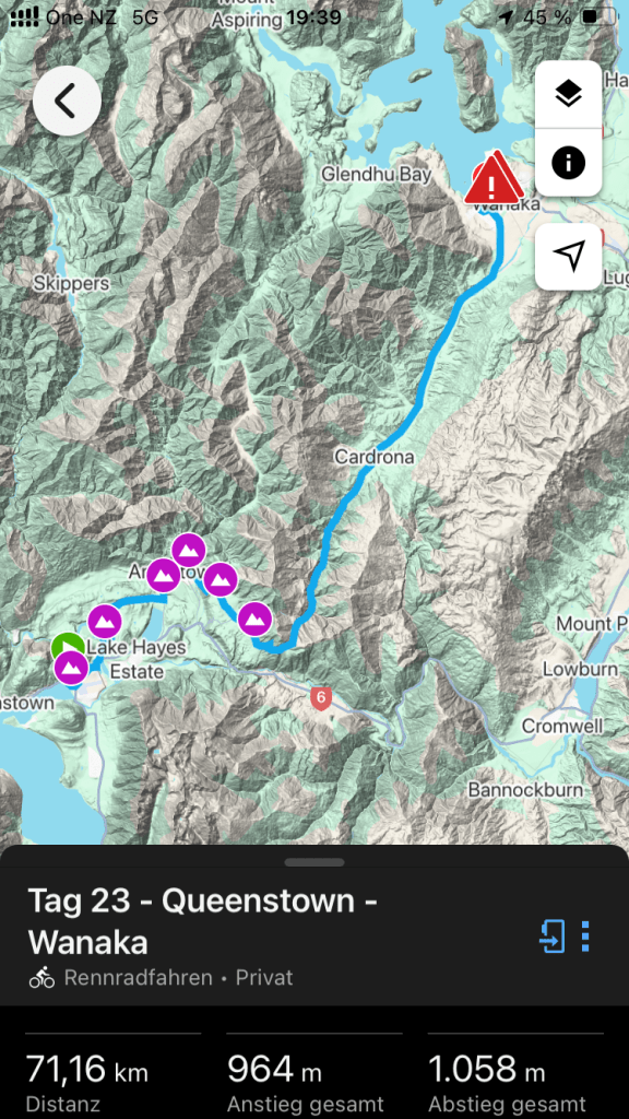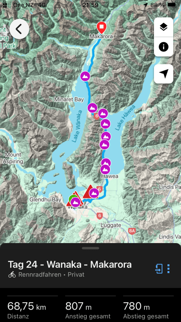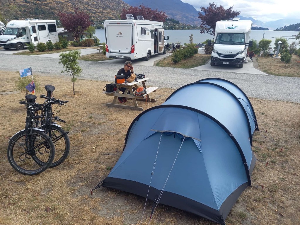 Tausend Höhenmeter erwarten uns heute. Am Stück. Wir müssen über die Berge nach Wanaka. Beim ersten Abschnitt meiden wir die Straße. Sie führt in steilen Serpentinen nach oben und ist stark befahren. Es gibt einen Radweg. Der ist anfangs noch fahrbar, aber dann geht er ebenfalls extrem steil nach oben. Ohne Serpentinen . Dafür mit Gravel, dicken Kieselsteinen, Furchen und im Schnitt 17 bis 18 % Steigung. Sabines Räder drehen durch. Dann halt Schieben. Zweieinhalb Kilometer weit. Klaus fährt meistens, nur im losen Kies muss auch er absteigen. Wir wären verrückt, meint ein Spaziergänger. Ja, sind wir. Doch es gibt für Radfahrer keine andere Option. Und wir müssen da rauf. Der Radweg endet an der Straße. Wir haben eine tolle Aussicht bis zu unserem Campingplatz, wo wir heute morgen gestartet sind.