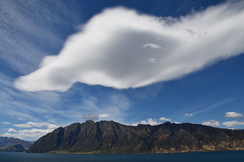 Es wird auch nicht besser, nachdem wir über einen Pass wieder an der Uferstraße des Lake Wanaka sind. Oft schaffen wir nur 10 km/h. So langsam waren wir noch nie. Da kann auch die atemberaubende Landschaft uns nicht mehr aufmuntern. An den zerfetzten Wolken sehen wir, wie stark der Wind bläst. Wir haben keine Lust mehr. Die letzten Kilometer gehen dann noch schnurgerade und leicht bergauf gegen den Wind. Endlich sehen wir unser Ziel. Eine Lodge mit kleinen Hütten und einem Restaurant. Die einzige Unterkunft auf einer Strecke von fast 140 km. Geschafft.