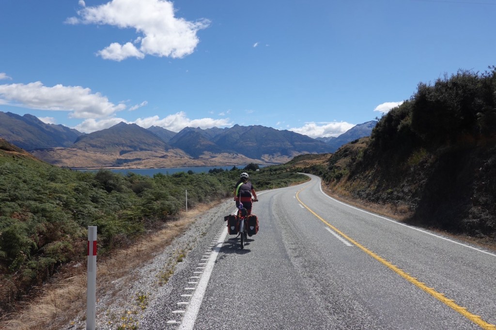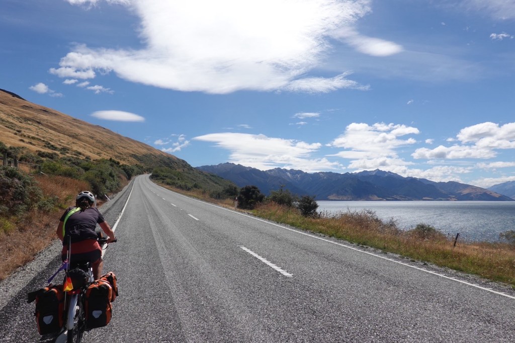 Gemeldet ist Südwind, doch der Wind kommt aus dem Norden. Uns direkt entgegen. Wir wollen zum Ende des Wanaka Lake. Dazu müssen wir zuerst zum Hawea Lake queren. Wir wählen den Radweg. Viele Mountainbiker nutzen ihn für eine Wochenend-Radtour. Für unsere Räder ist er an vielen Stellen nicht geeignet. Wieder einmal. Das Experiment Radweg in Neuseeland ist damit gescheitert. Am Hawea Lake gibt es sowieso nur noch die Straße entlang des Sees. Sie hat einige Steigungen, aber unser Hauptproblem ist heute der Gegenwind. Wir kommen einfach nicht voran. Den ganzen Tag im Schneckentempo.