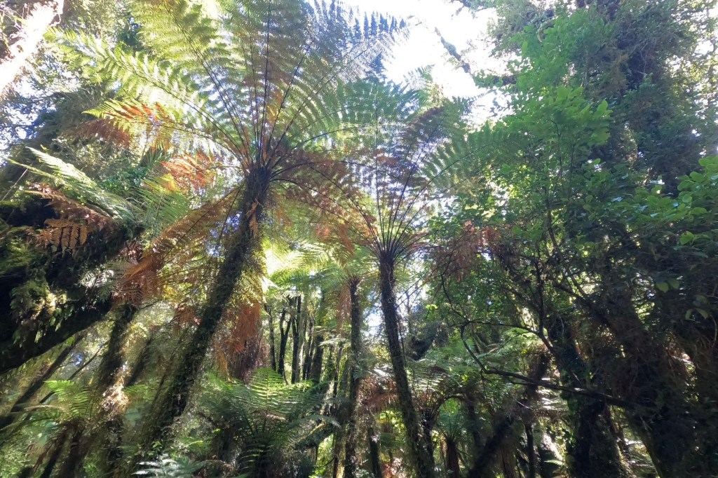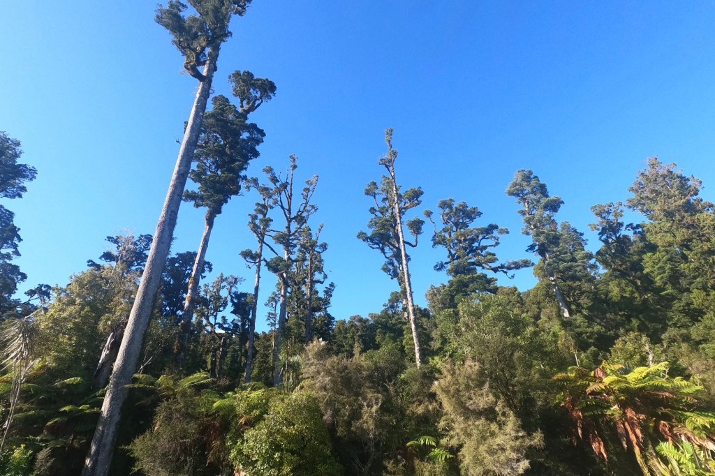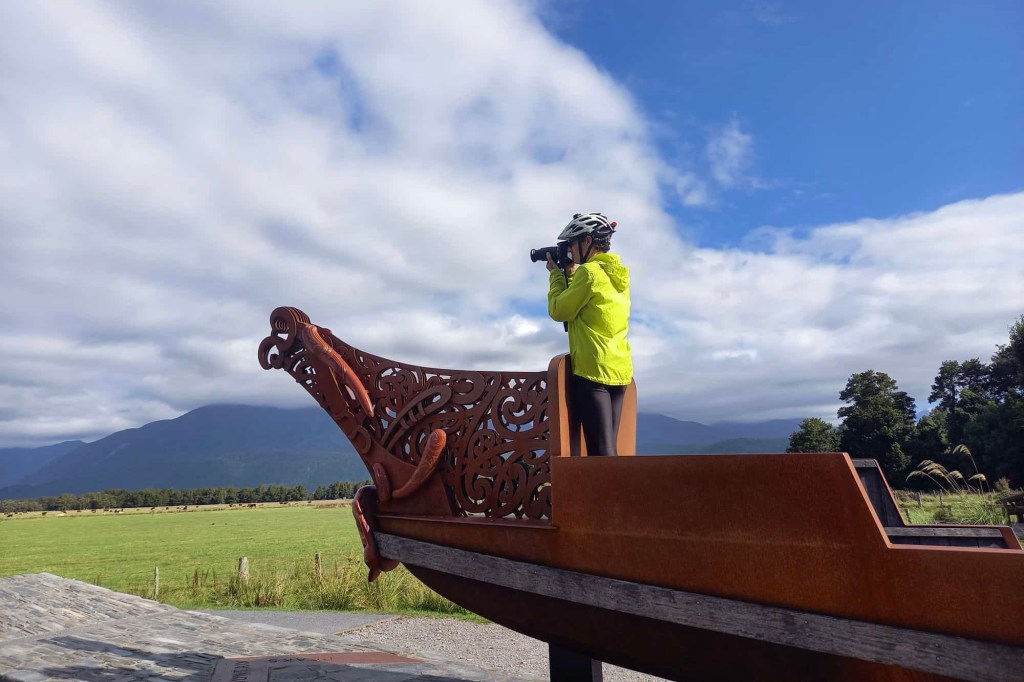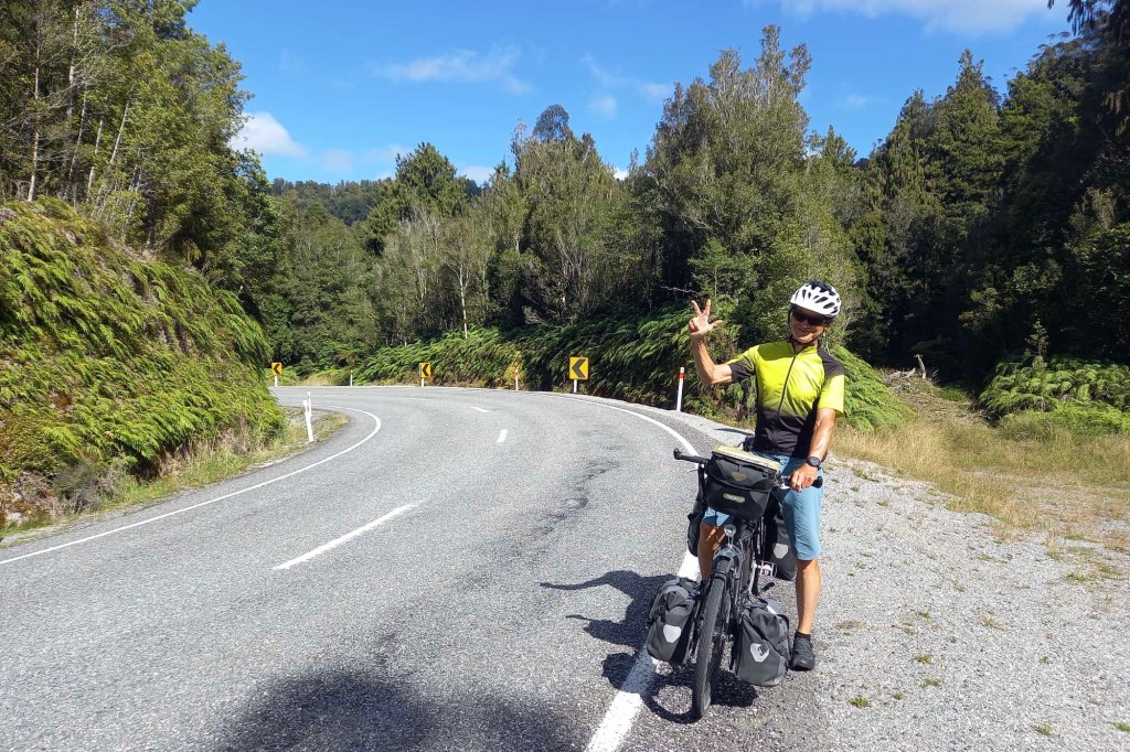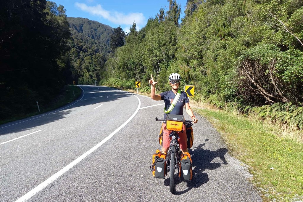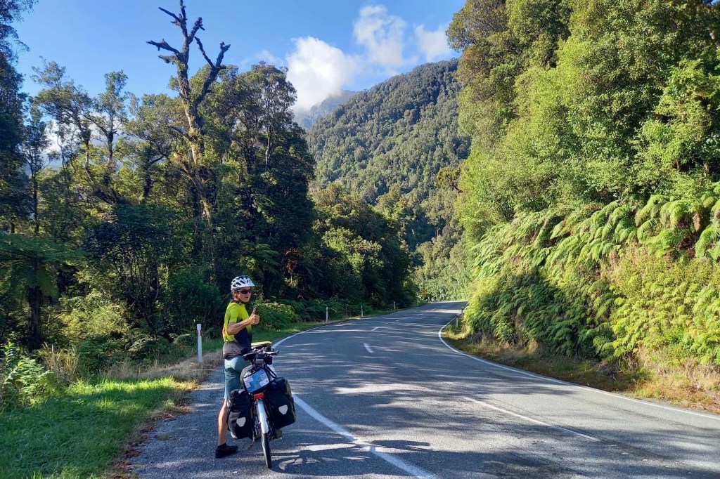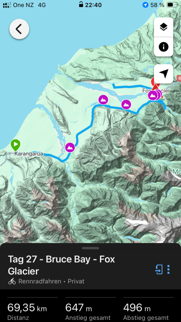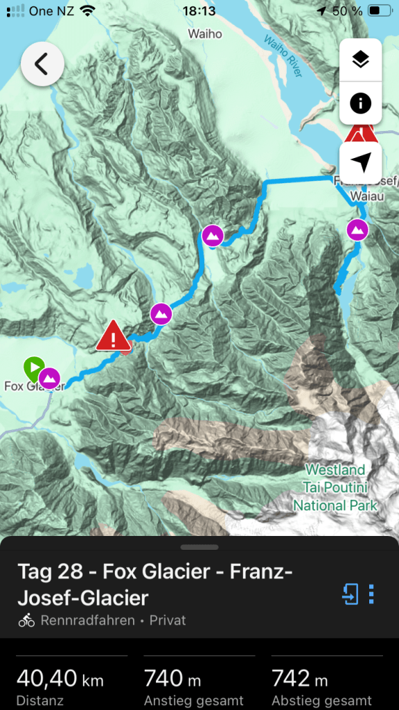 Noch ein Gletscher. Der Franz Josef Glacier. Benannt nach dem Kaiser Franz-Josef l von Österreich. Der Gletscher war aus dem Flugzeug noch imposanter als der Fox. Auch ihn wollen wir von unten sehen. Deshalb fahren wir heute nur bis zum Nachbarort nach Franz Josef Township. Nur ungefähr 30 km , dafür aber über drei Pässe und insgesamt über 600 Höhenmeter. Es ist wieder eine landschaftlich schöne Strecke durch die steilen Hügel, die komplett durch den Rain Forest führen. Wir könnten die Fahrt eher genießen, wenn es nicht täglich diese Schreckmomente durch viel zu eng an uns vorbei fahrenden Fahrzeugen gäbe. Heute ist es ein LKW, gestern ein Van und vorgestern ein Wohnmobil. Das kostet Nerven. Im Ort gibt es einen Radweg. Doch der ist zugeparkt. Viele Touristen starten hier zu ihrem Gletscherabenteuer per Helikopter. Wir geben wieder unsere Radtaschen auf dem Campingplatz ab. Wie gestern. Und fahren über einen Radweg bis zum Ausgangspunkt des Walkaways zum Glacier Lookout.