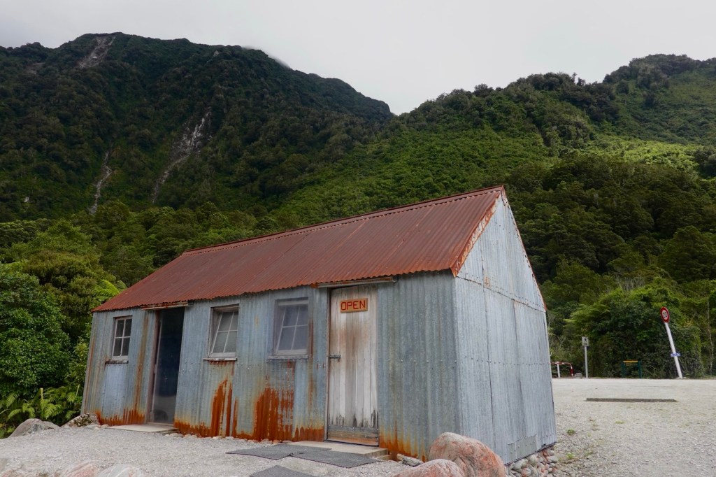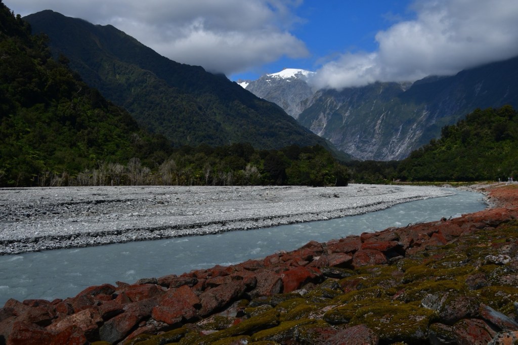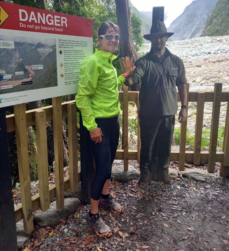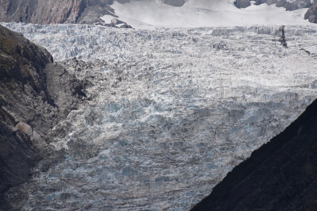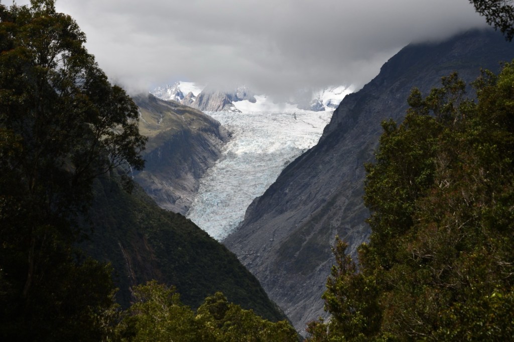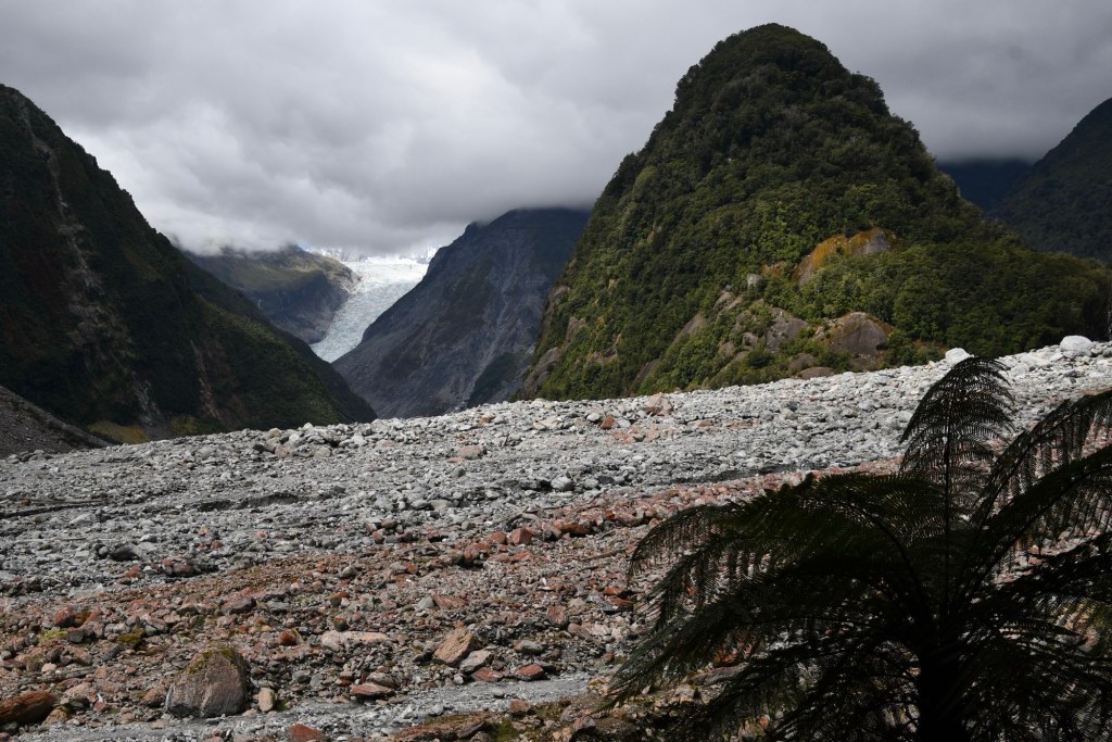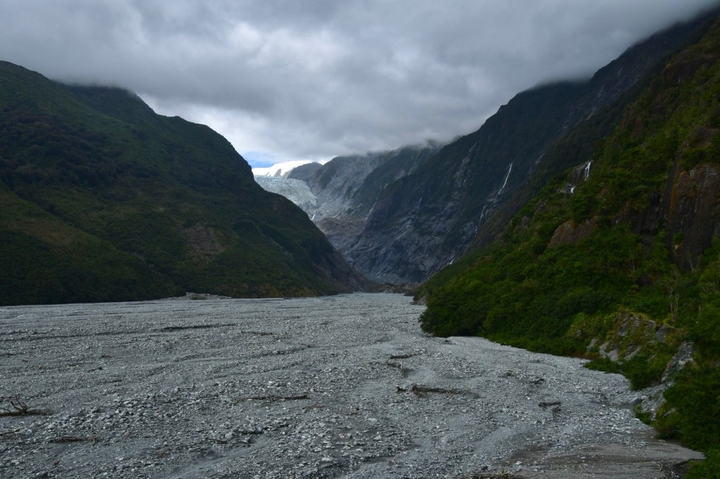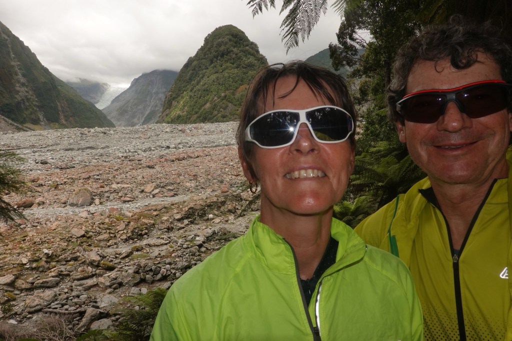 Ohne Gepäck fahren wir den Wander- und Radweg bis zum Aussichtspunkt auf den Gletscher hoch. Der Weg führt durch wunderschönen Wald. Wir haben Glück. Wir sehen den Gletscher mit seinen vielen tiefen blau schimmernden Spalten. Die Sonne lässt ihn gerade noch strahlen. Über ihm sind dunkle graue Wolken. Und unter ihm ist eine riesige Schotterfläche. Ganz früher hat er mal fast bis zum Meer gereicht. Heute liegt seine Gletscherzunge 300 m über dem Meeresspiegel. Sehr niedrig für einen Gletscher. Doch er verändert sich ständig. Bis 2007 dehnte er sich sogar aus. Danach zog er sich zurück. Grund dafür ist seine schnelle Fließgeschwindigkeit. Er schiebt sich einen Meter pro Woche vorwärts. In tieferen Lagen schmilzt er. Bei überdurchschnittlichen Schneefällen in den Bergen wächst seine Masse. Doch auch hier macht sich der Klimawandel bemerkbar. Die Hänge seitlich des Moränengebietes stürzen bei starken Niederschlägen ein. Wo früher noch Wege zu Aussichtspunkten weiter oben führten, ist heute nur noch Geröll. Vor dem Betreten der Geröllflächen wird eindrücklich gewarnt.
