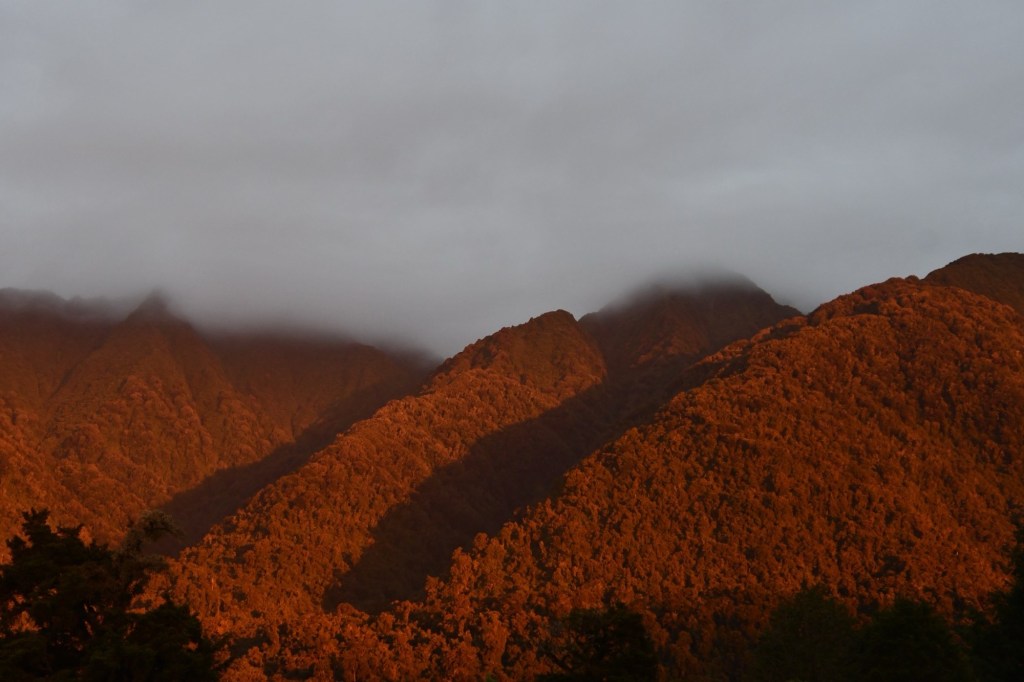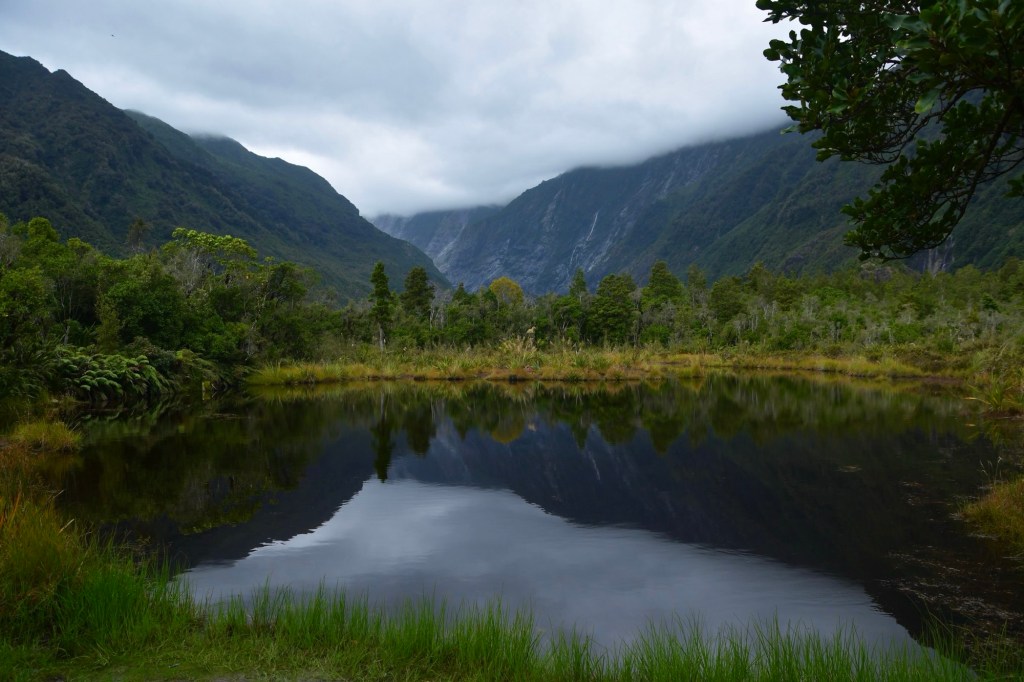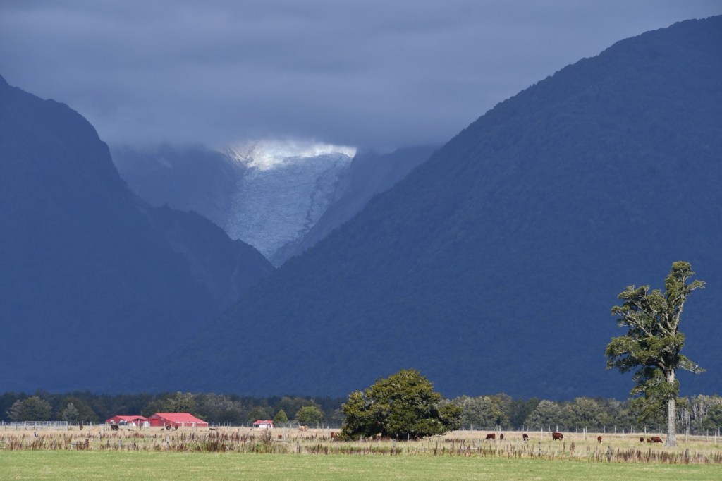Wir sind beeindruckt von der Schönheit der Eismasse. Ob sie ewig besteht, ist fraglich. Schön, dass wir den Gletscher noch so sehen können. Doch wir haben noch nicht genug von Gletscherblick. Wir fahren in Richtung Tasman Sea zu einem 10 km entfernten Aussichtspunkt. Und haben wieder Glück. Zwischen schwarzen Bergen und unter grauen Wolken schimmert der Fox Glacier weiß in der Sonne.