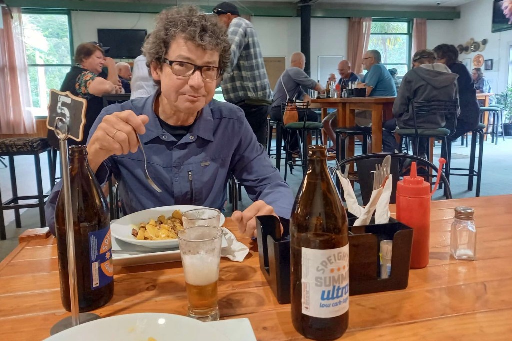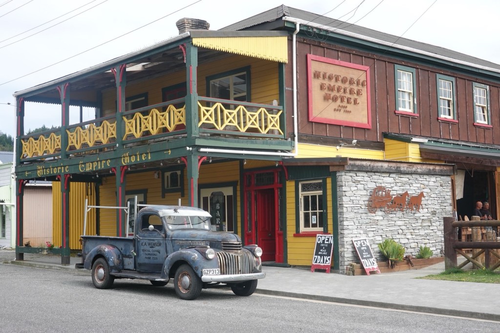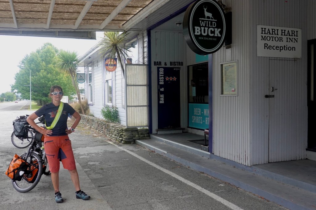 Das Hari Hari Hotel ist schwer in die Jahre gekommen und wirkt etwas unaufgeräumt. Unser Zimmer ist okay. Früher war das Hotel bestimmt einmal ganz schön. Es gibt Zimmer, einen Zeltplatz, eine Bar, einen Bottle Store und ein Restaurant. Schon am Nachmittag ist in der Bar was los. Die Farmer treffen sich hier nach getaner Arbeit. In kurzen Hosen und Gummistiefeln oder barfuß. Touristen verirren sich sicher nur selten hierher. 42 der 44 Zimmern bleiben leer. Nach zwei Tagen in Touristenzentren ist es für uns ein interessanter Kontrast. The real life of New Zealand spielt sich hier ab.