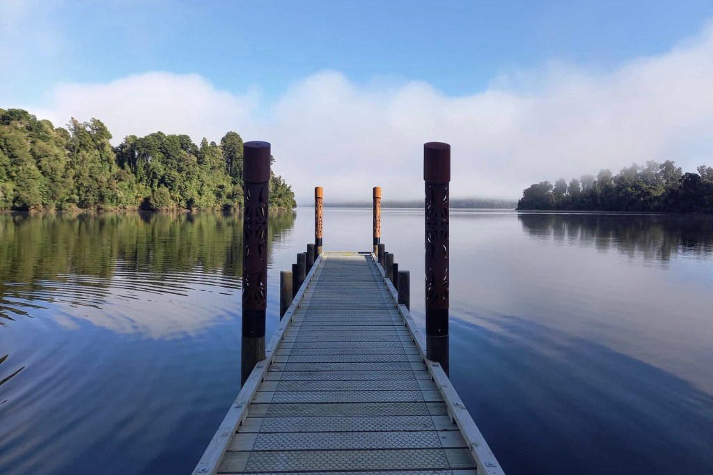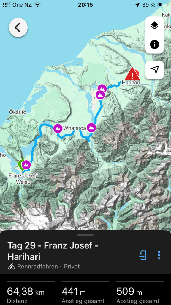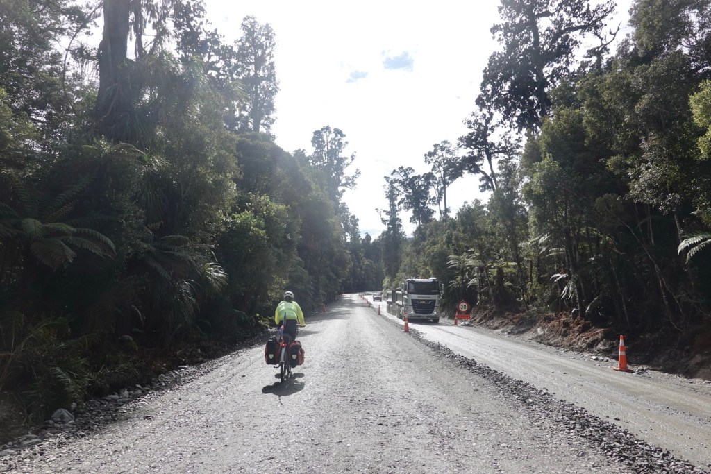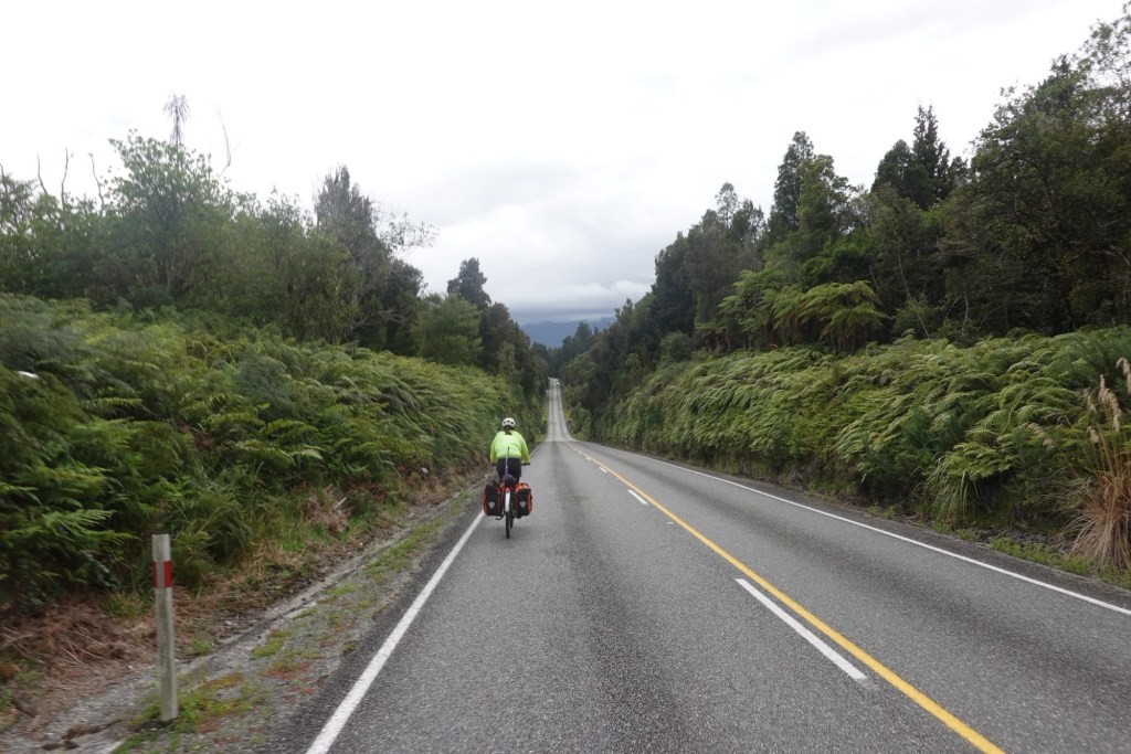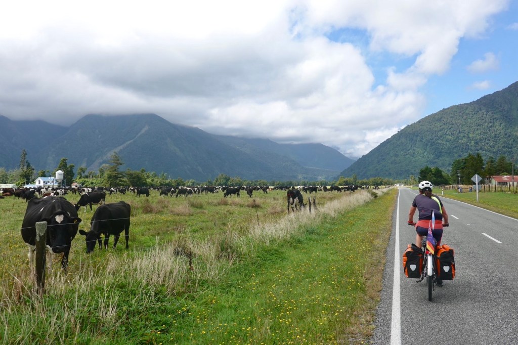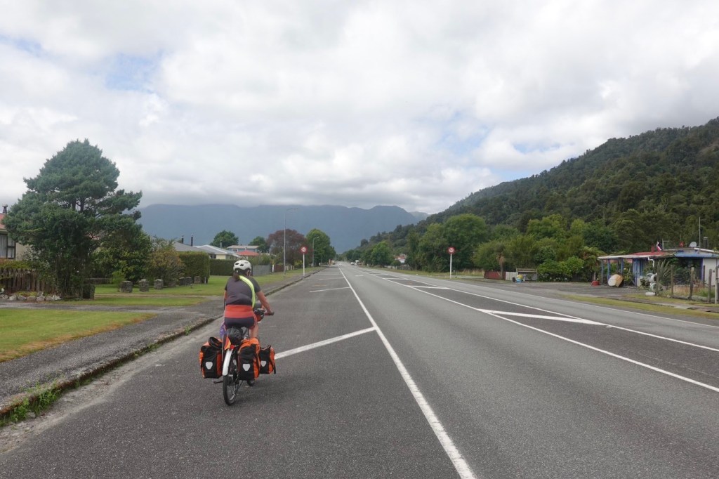 Hari Hari ist heute unser Ziel. Es heißt aus der Māori Sprache übersetzt soviel wie „Freude haben“. Es liegt zwischen großen Flüssen am Fuß der Alpen. Wir fahren den State Highway 6. Mit wenig Verkehr. Gleich hinter Franz Josef ist ein großer See. Die gletscherbedeckten Berge spiegeln sich darin. Wir sehen sie gerade noch, kurz danach sind sie in Wolken. Wir treffen einen netten Pfälzer, einen Nachbarn aus Speyer. Als Radfahrer und Neuseeland-Vielreisender versorgt er uns mit Tipps und Wetter- und Windprognosen für die nächsten Tage.