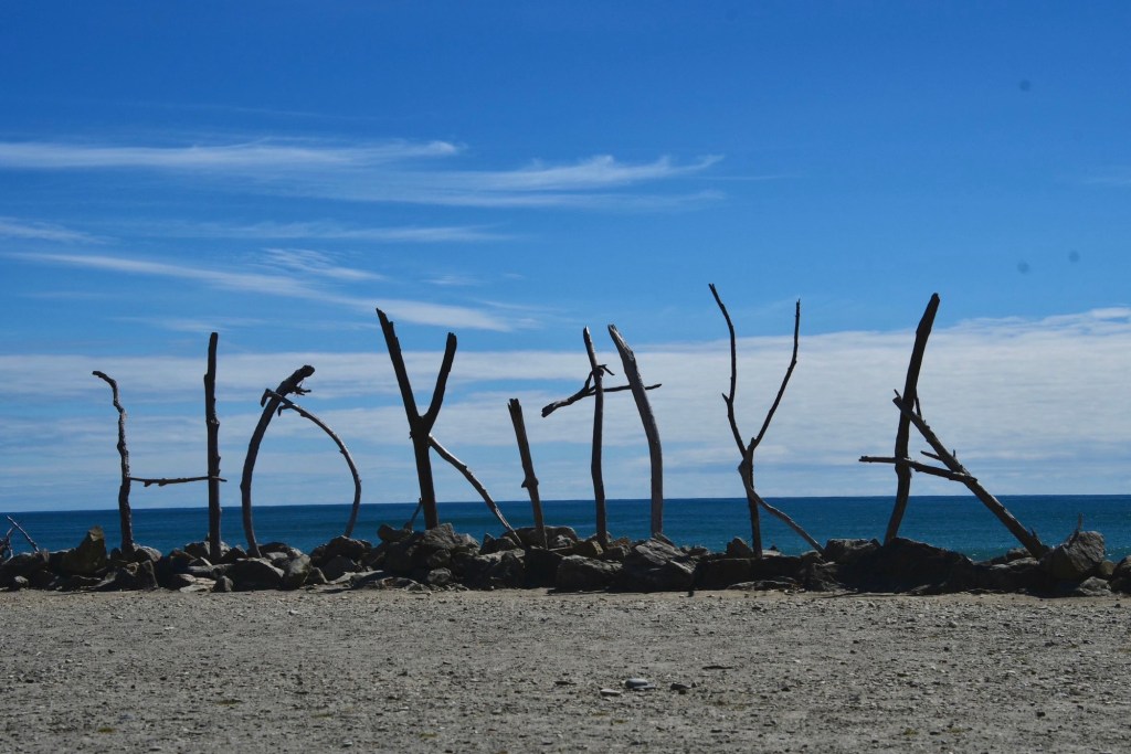 Kurz vor Hokitika müssen wir einem Farmer aber noch eine gelbe Zitrone für den unfreundlichsten Neuseeländer verleihen. Er überholt uns mit seinem Geländewagen ganz eng und in hoher Geschwindigkeit. Sabine erschrickt, ruft ihm hinterher und zeigt ihm einen Daumen nach unten. 50 m weiter parkt er seinen Wagen am Straßenrand, steigt aus und erwartet uns mit verschränkten Armen: „What’s your problem?“. Sabine: „You are too fast and too close to us.“ Er antwortet uns mit einem Redeschwall in seinem neuseeländischen Englisch. Doch eins verstehen wir: es ist sein Land und er mag keine Radfahrer. Und wenn sie hier auf seiner Straße fahren , dann gehören sie mit ihren Rädern hinter die Straßenbegrenzung. In den Seitenstreifen. Leider ist der an dieser Stelle nur 5 cm breit. Von einem Abstand von 1,5 m will er nichts wissen. Und die Schilder mit Radfahrern und „Share the road“ wird er auch in Zukunft ignorieren. Denn es ist ja sein Country. Glücklicherweise sind die meisten Neuseeländer nicht so. In Hokitika am Strand und vorm Supermarkt schauen einige interessiert nach unseren Fähnchen und wünschen uns gute Fahrt.