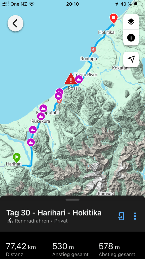 Wir stoppen in Ross. Hier wurde im 19. Jahrhundert nach Gold geschürft. Es gab hier einen regelrechten Goldrausch. Der größte Nugget wurde 1909 gefunden und wog 3,1 kg. Seit 1988 gab es Abbau im Tagebau, heute als See verfüllt. Ein historisches Dorf bietet einen Einblick in das Leben der Minenarbeiter. Übernachten wollen wir in Hokitika. Trotz vieler kleiner Anstiege kommen wir heute schnell voran.