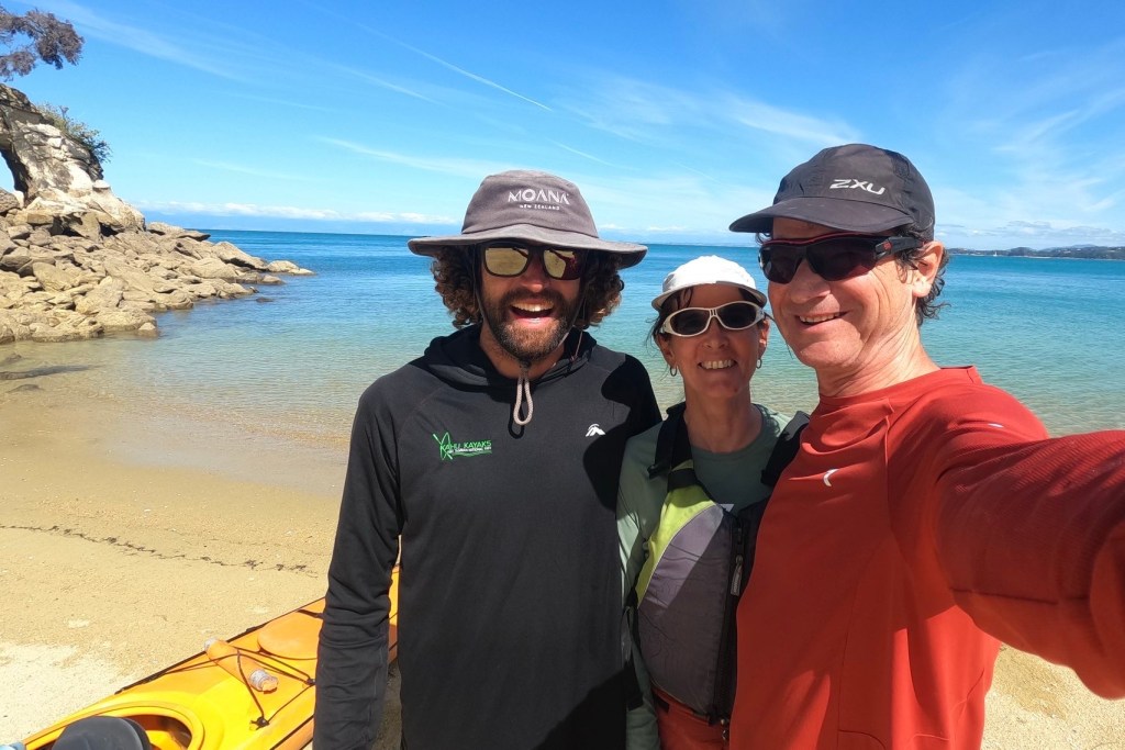 Die einzigartige Landschaft des Abel Tasman Nationalparks wollen wir heute vom Meer her erkunden. Wir haben eine ganztägige Kajaktour gebucht. Wieder werden wir morgens am Campingplatz abgeholt. Einige junge Leute steigen später in den Kleinbus ein. Oh je, nur junge Leute und wir Oldies? Doch wir bekommen einen privaten Guide. Griff begleitet nur uns beide auf unserer ersten Seekajak-Tour. Kanadier, also Kanu, sind wir schon öfters gefahren. Aber noch nie Kajak im Meer. Griff weist uns ein. Falls wir umkippen, müssen wir keine Eskimo-Rolle können. Die Spritzdecke ist leicht lösbar.