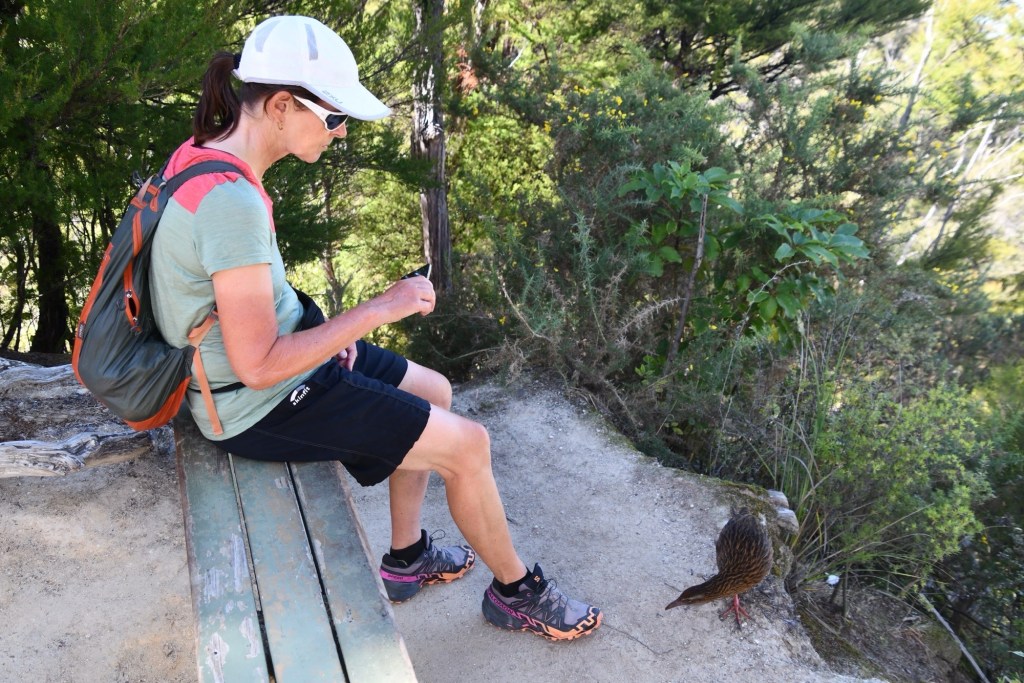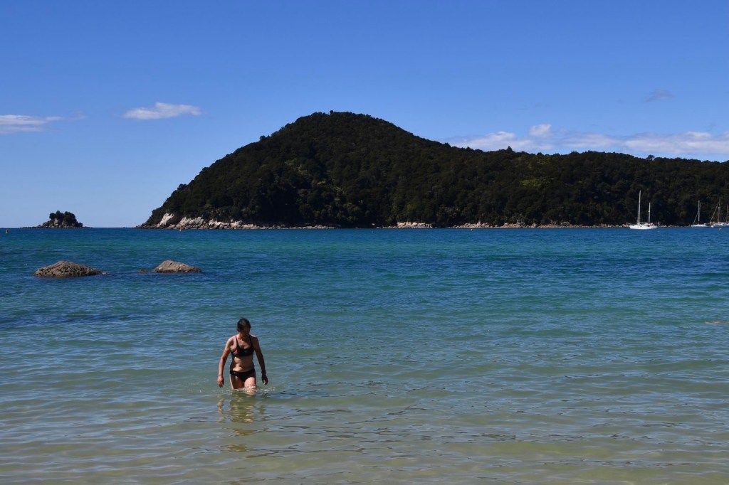 Es ist einiges los auf dem Track. Er ist sehr populär. Viele wandern die 60 km in 3-4 Tagen und übernachten in Camps in den Buchten. Es gibt dort ein Toilettenhäuschen und Wasser zum Abkochen. Das Essen für vier Tage muss man im Rucksack schleppen. Bequemer, aber sehr teuer, ist es mit Komplettpaketen von einigen Anbietern. Sie bieten Übernachtungen in Lodges, mit Essen und Gepäcktransport an. Wir wandern die schönste der vier Etappen. Die Wartezeit auf unseren Rückfahr-Shuttle verkürzen wir mit einem Bad im Meer an einem traumhaften Strand. Der erste Tag im Abel Tasman Nationalpark ist ein Highlight unserer Reise.