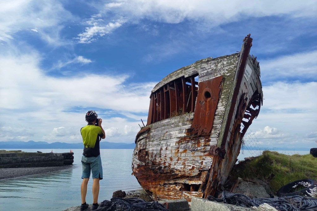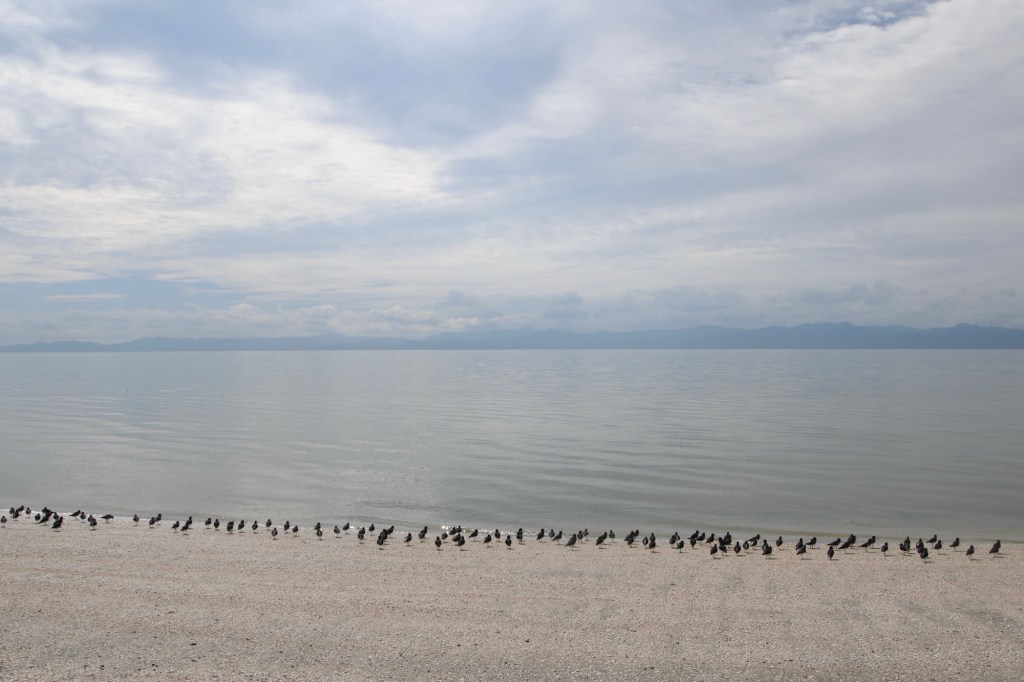 Der Hauraki Rail Trail geht noch ein Stück weiter. Durch eine riesige Bucht immer am Meer entlang. Wir sehen kein Meer. Die Wetlands, ein breiter Streifen mit Mangroven ähnlichen Büschen, die bei Flut im Wasser stehen. In Australien würde es hier von Krokodilen nur so wimmeln. In Neuseeland gibt es keine gefährlichen und keine giftigen Tiere, Reptilien oder Insekten. Dafür jede Menge seltene Zugvögel. Und hier in Miranda ist ein Vogelschutzgebiet. Besonderen Schutz genießt der Poaka, engl. Pied Stilt. Er fliegt jedes Jahr von Alaska genau in dieses Gebiet in Neuseeland um zu brüten. Und dann über Sibirien wieder nach Alaska. Der Poaka , zu Deutsch: Fußstelze, ist ein Native Bird, ein endemischer Vogel Neuseelands. Wir kommen aus den Wetlands an einen Strand aus zerkleinerten Muscheln. Hunderte Vögel sitzen dort.