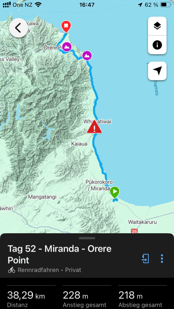 Ab jetzt haben wir Meerblick. Zuerst auf dem Radweg, dann auf der Straße. Ohne viel Verkehr. Nach ein paar Steigungen kommen wir nach Orere Point. Auf den Campingplätzen ist nicht mehr viel los. Es wird Herbst. Die Saison ist zu Ende. Wir haben noch Zeit für einen Strandspaziergang. Und zum Wäsche waschen. Morgen ist unser letzter Radtag mit Gepäck.