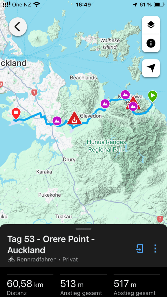 Ursprünglich wollten wir noch ein paar Tage länger Rad fahren. Um die Halbinsel Coromandel herum. Doch vor der Straße an der Ostküste wurden wir mehrmals gewarnt. Viele Autos und vor allem Logging Trucks, Holztransporter mit zwei Anhängern. Sie fahren die gefällten Stämme aus dem größten von Menschen angepflanzten Waldgebiet der südlichen Hemisphäre ab. Und sie sind für Radfahrer gefährlich. Dazu haben wir keine Lust mehr. Wir fahren deshalb kürzer nach Auckland. Wir werden uns dort einen größeren Wagen mieten, in den die Räder rein passen. Damit fahren wir dann weiter nach Norden und zurück nach Coromandel. So ist es heute unsere letzte echte Radetappe.