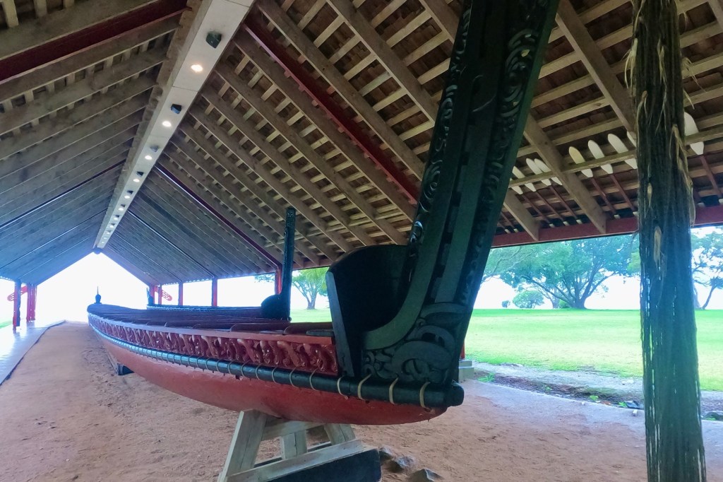 Es hört nicht auf zu regnen. Glücklicherweise gibt es in Waitangi ein Regenprogramm für uns. Kein sportliches, sondern ein kulturelles. Wir besichtigen die Waitangi Treaty Grounds. Neuseelands wichtigste historische Stätte. Hier wurde 1840 der Vertrag von Waitangi zwischen Vertretern der britischen Krone und 500 Māori-Chiefs unterzeichnet. Der Vertrag gilt als Neuseelands Gründungsdokument. Es gab eine englische Version und eine in Māori. In der Māori-Übersetzung war der Wortlaut in wichtigen Passagen fehlerhaft. Falsch übersetzt. Die Māori unterschrieben die Māori-Version, nachdem sie sie untereinander diskutiert hatten. Doch viele verstanden sie nicht. Sie übertrugen mit dem Vertrag die Souveränität ihres Landes an die britische Krone. Sie dachten aber, sie könnten sich weiterhin selbst verwalten.