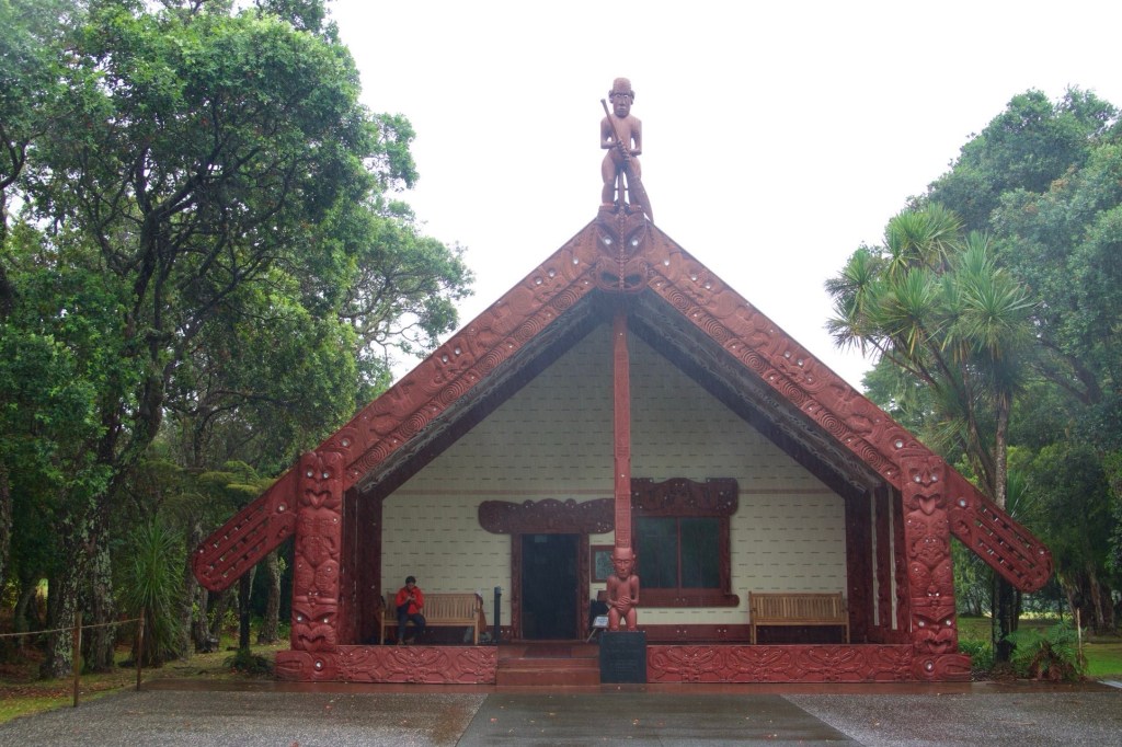In den Waitangi Treaty Grounds wird dies alles dargestellt. Es gibt zwei Museen, das Treaty House, und ein Wharerunanga, ein Versammlungshaus, mit Tanz und Gesang. Auch das weltweit größte Waka, Kanu, in dem 80 Krieger Platz finden, ist ausgestellt. Wir verbringen im Regen fast fünf Stunden an diesem Ort und informieren uns intensiv über die Geschichte Neuseelands und seiner unterschiedlichen Besiedler. Erschreckend finden wir die Darstellung des Landverlustes der Māori seit 1840. Per Gesetz sind sie den Paheka gleichgestellt, doch die sozialen Unterschiede fallen uns auf unserer Reise ständig auf. In abgelegenen Orten mit heruntergekommenen Häusern weht überall die Māori-Flagge. Die schmucken Häuser an den Küsten und Badestränden gehören den Paheka. Die Schere zwischen Arm und Reich ist offensichtlich. Die zunehmende Privatisierung der Wirtschaft hat das historische Prinzip der Gleichheit zunichte gemacht. Aber das gab es eh nur auf dem Papier des Vertrages von Waitangi. Ein interessanter Tag, statt Sport und Natur, einmal die Kultur Neuseelands kennenzulernen.
