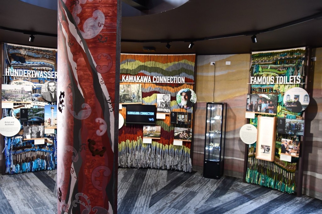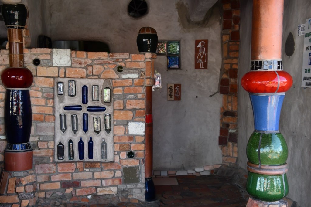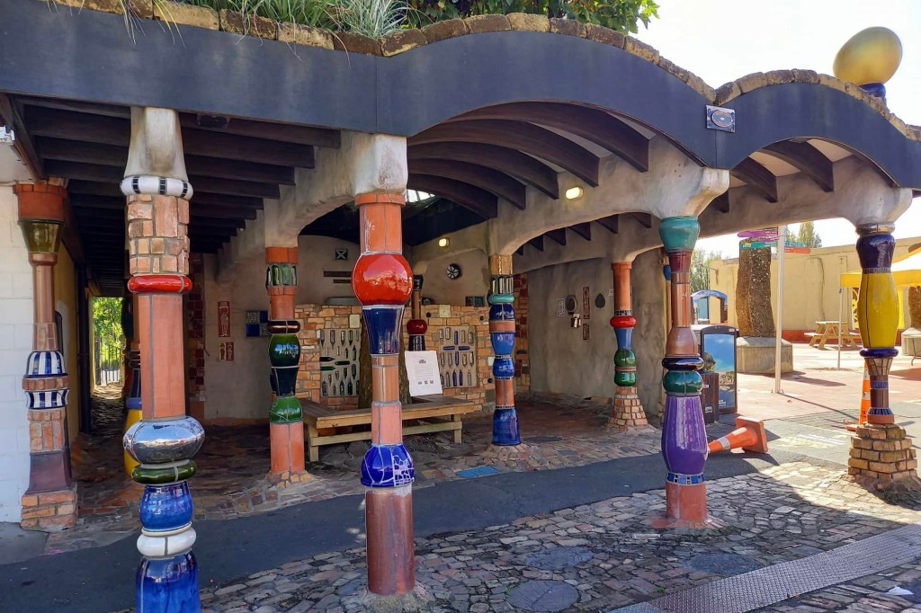 Wir möchten heute die Hälfte der Strecke nach Auckland zurückfahren. Ungefähr 160 km bis Whangārei. Für eine solche Entfernung muss man in Neuseeland schon etwas Zeit einplanen. Zuerst geht es in die Berge. Es ist wie Achterbahn fahren. Alle 20 m eine enge Kurve. Längs steil und auch im Querprofil. Spannend. Doch die Kulisse ist schöner als auf einer Achterbahn. Links und rechts Berge mit subtropischem Regenwald. Dann durch Farmland. Die Hügel bleiben, die Straße ist nicht mehr ganz so kurvig. In Kawakawa machen wir halt. Hier hat der österreichische Künstler Friedensreich Hundertwasser von 1973 bis zu seinem Tod 2000 gelebt. Er hat sich neben seinem großen Umweltengagenent in der Kleinstadt mit einem praktischen Kunstwerk eingebracht. Er hat für Kawakawa eine öffentliche Toilette in seinem typischen Architektur- und Kunststil entworfen. Sie ist die meistfotografierte Toilette Neuseelands. Ja, wir machen auch Fotos davon.
