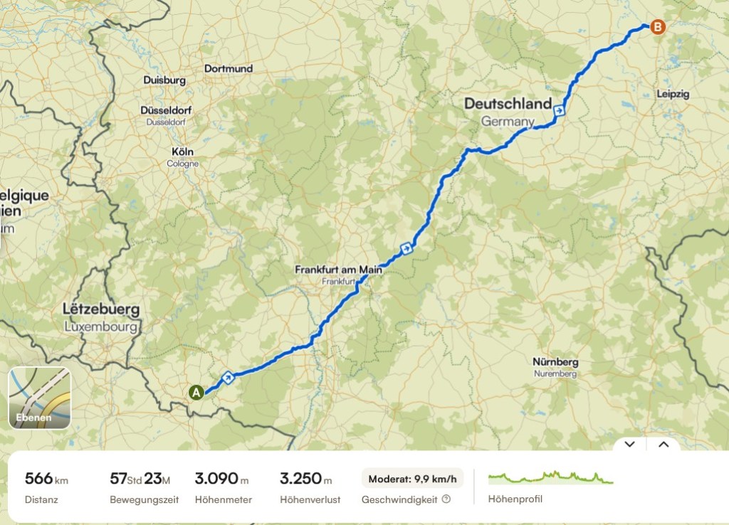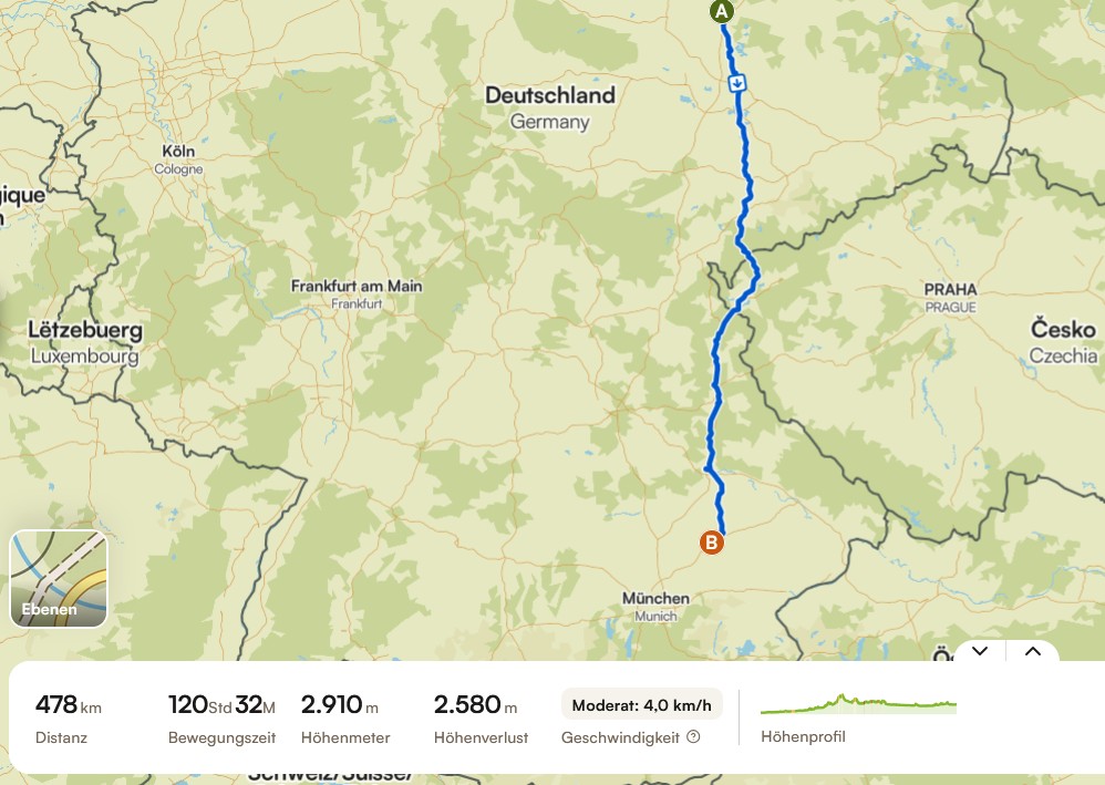 Wir treffen uns alle zwei Jahre mit der großen Familie, meistens im Geburtsort meiner Mutter, in Dessau-Roßlau. So auch im Jahr 2025. 600 km Anfahrt, ein Tag feiern und erzählen, 600 km Heimfahrt. Das ist uns in diesem Jahr zu viel. Sabine hat keine Ferien, so bleibt nicht mehr Zeit als ein Wochenende. Ich werde alleine hinfahren. Warum eigentlich nicht mit dem Rad? Ich beginne mit der Streckenplanung. Ich plane eine komplette Deutschlandtour mit der Teiletappe Familienfest. Nächstes Etappenziel: Besuch bei einem sehr guten alten Freund in Landshut. Und finishen werde ich im Schwarzwald bei Sarah, wo wir unser kleines Familienfest feiern werden. Zu dritt, weil das am 3. Oktober sein wird. Sabine kommt am Feiertag auch nach Hinterzarten. Aber jetzt der Reihe nach.