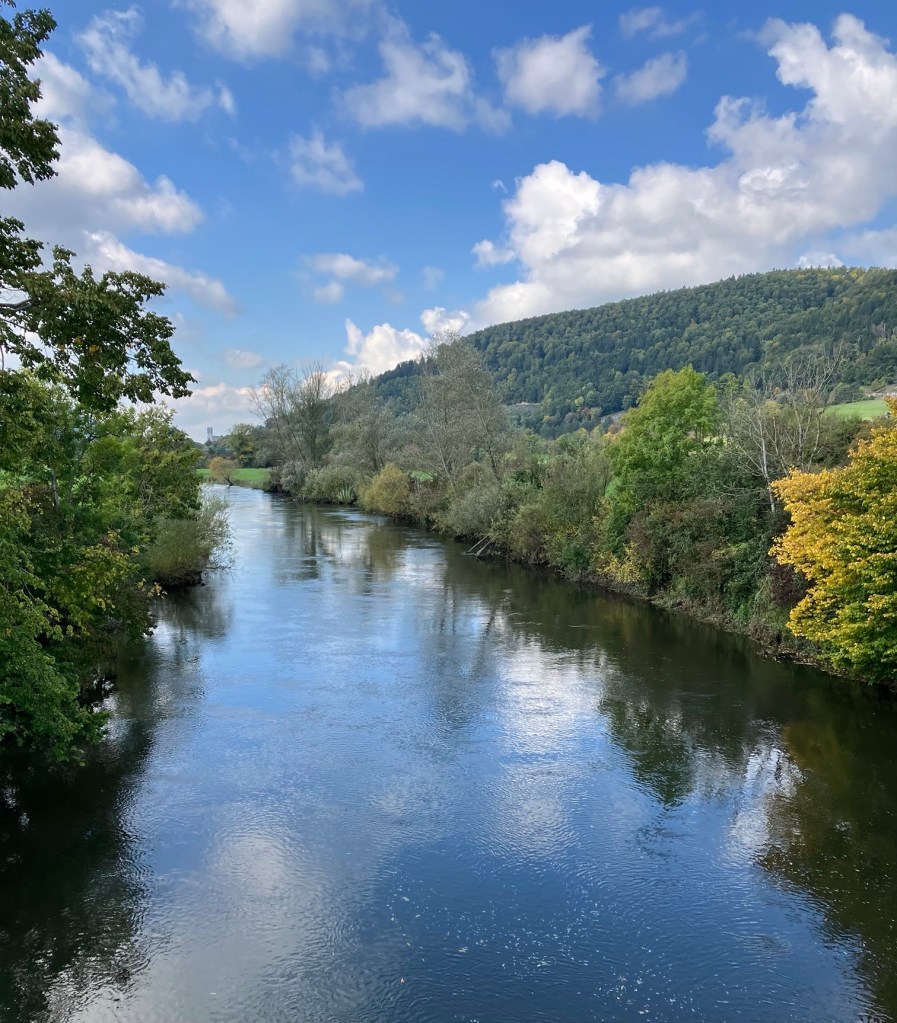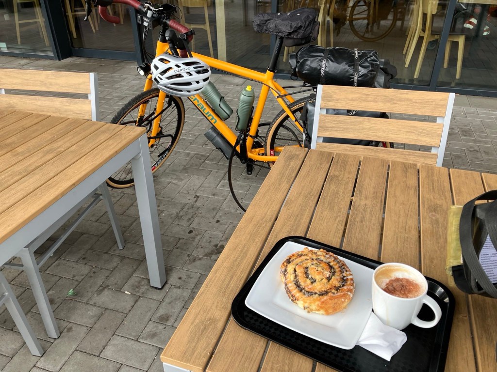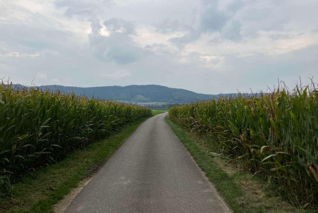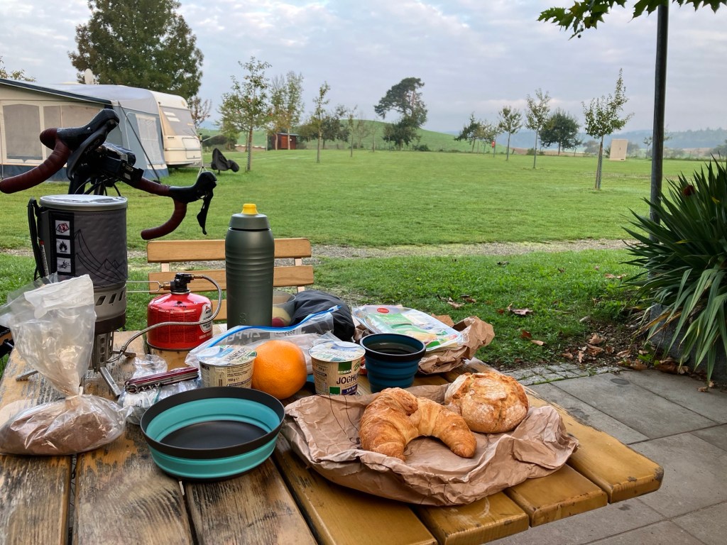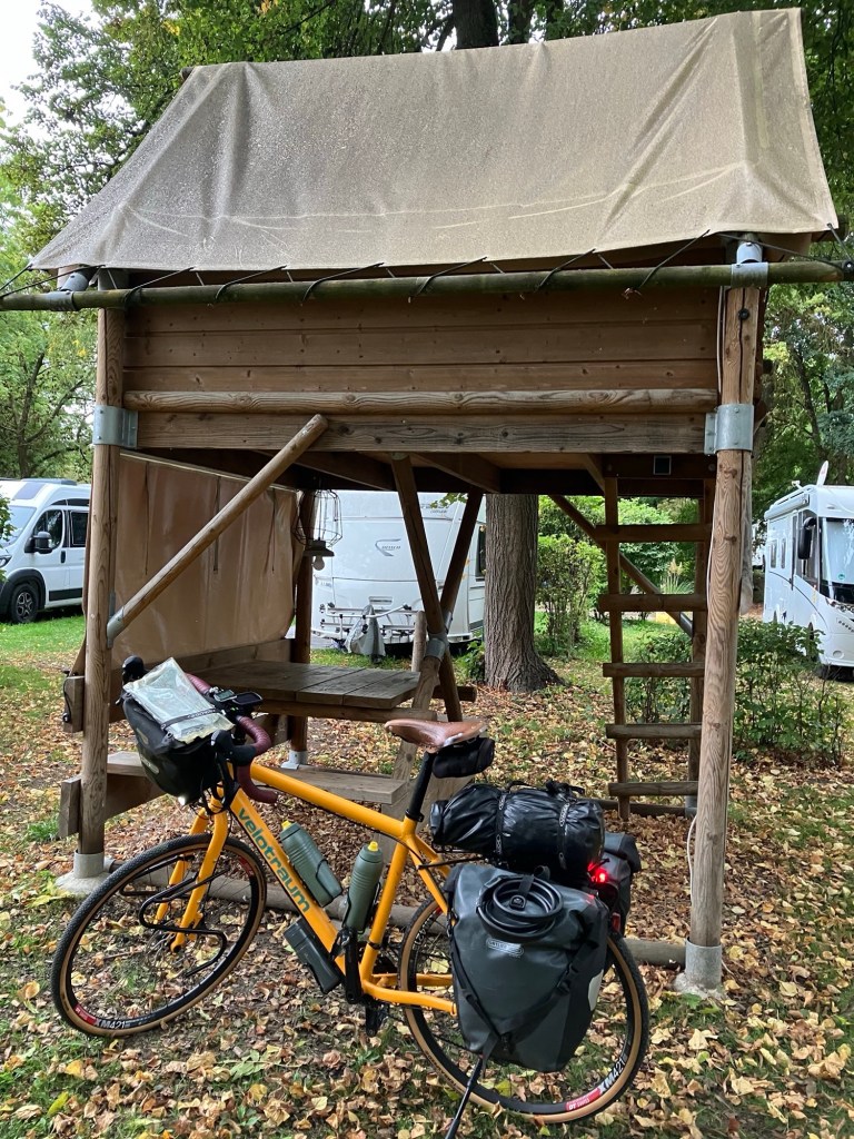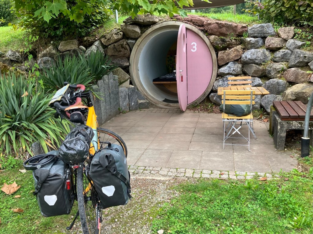 Glücklicherweise habe ich die Tage durch das Voralpenland und weiter bis in den Schwarzwald mit einer maximalen Länge von ca. 100 km geplant. Eigentlich wegen der Berge. Aber viel mehr aufgehalten haben mich, im positiven Sinn, drei, vier oder mehr Telefonate mit Stephan. Nicht ganz soweit geht es auch heute über den Bodenseeradweg bis ins Hegau nach Orsingen. Unterwegs überhole ich tatsächlich einen weiteren Radreisenden. Ich fahre einige Kilometer gemeinsam mit ihm. Er hinterfragt technische Tipps und freut sich über Routenanregungen. Und dann kommmt auch schon wieder der Regen. Deswegen miete ich auf dem Campingplatz in Orsingen ein Schlaffass. Aber ein sehr originelles, man schläft auf einem Holzbrett in einem Betonrohr, dass in einen Erdwall eingebaut ist. Ich fühle mich wie bei den Hobbits. Die letzte Etappe führt mich an die Donau. Nach der Donauquelle in Donaueschingen klettere ich 20 km bergauf, in moderater Steigung bis in den Schwarzwald. Sarah kommt mir mit dem Fahrrad entgegen. Wir treffen uns in Schwärzenbach. Der Empfang im Schwarzwald kann nicht typischer sein. Wir lassen es uns spontan bei einer echten Schwarzwälder Kirschtorte richtig gut gehen.