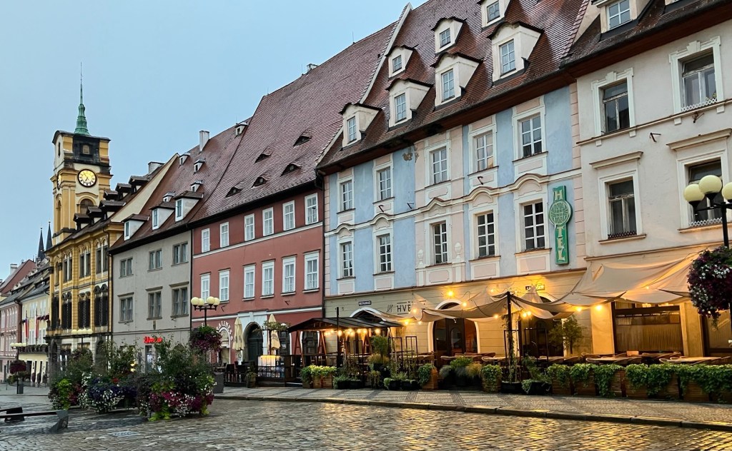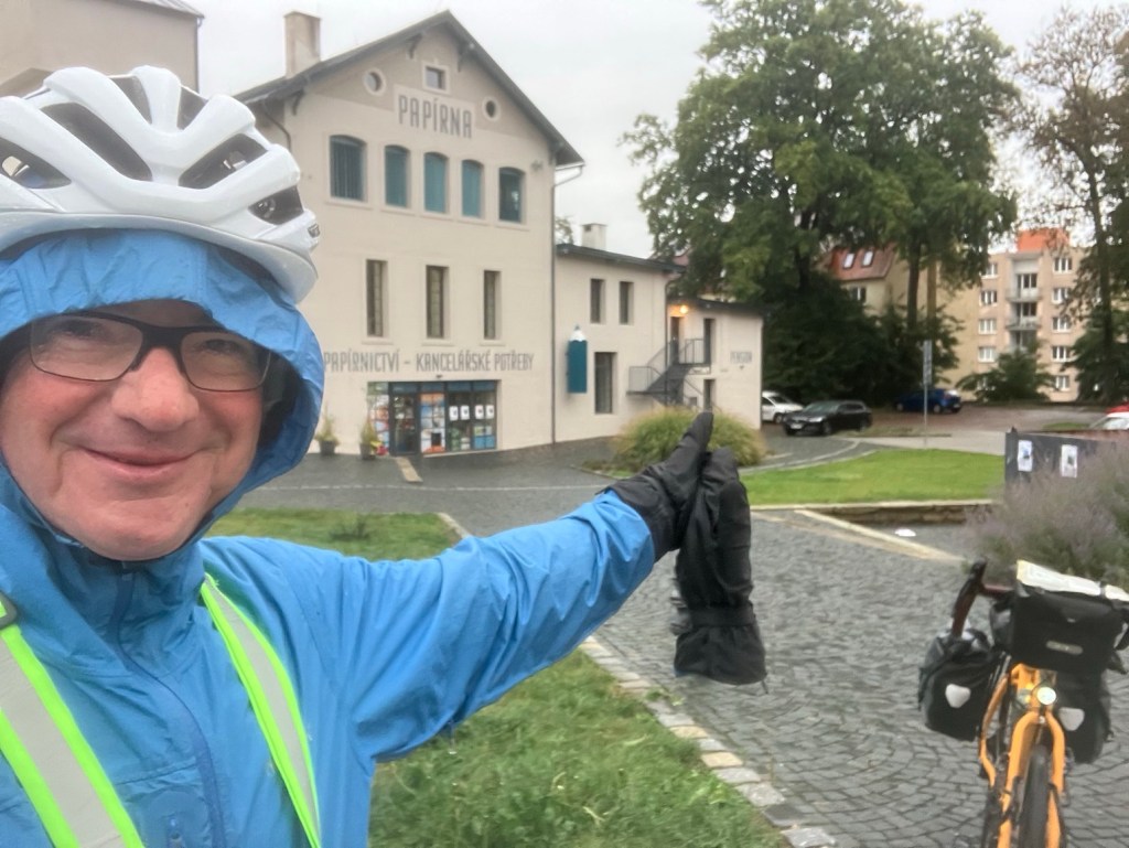 Ich habe mich so auf das landschaftliche Highlight gefreut, auf das westliche Erzgebirge mit einem Abstecher nach Tschechien. Aber das wird zur reinen Zitterpartie. Im Nieselregen klettere ich bis zum höchsten Punkt. Jetzt schüttet es aus Eimern. Ich bin bergab kaum schneller. Und ich kühle sofort aus, alles ist nass. Der ganze Körper zittert. Das Fahrrad reagiert darauf mit einem unsicheren Gewackel bis nach Klingenthal. Ein kleines Café ist meine Rettung. Ich kann mich aufwärmen, aber in einem unendlich langsamen Prozess. Nach fast einer halben Stunde, nach einem heißen Tee und aufmunterndem Kuchen, sitze ich immer noch mit klappernden Zähne da. Das erweckt wohl unsägliches Mitleid. Ich werde fortlaufend mit frischen Heißgetränken und Gebäck versorgt, kostenfrei. Vielen Dank. Nach einem netten Plausch mit einem radbegeisterten Grenzbeamten bin ich in Tschechien. Nach viel Auf und Ab auf fast autofreien kleinen Sträßchen im Dauerregen erreiche ich mein Ziel in Cheb, oder in Deutsch Eger. „I am so happy to be here“ klappere ich dem Besitzer der Penzion entgegen.